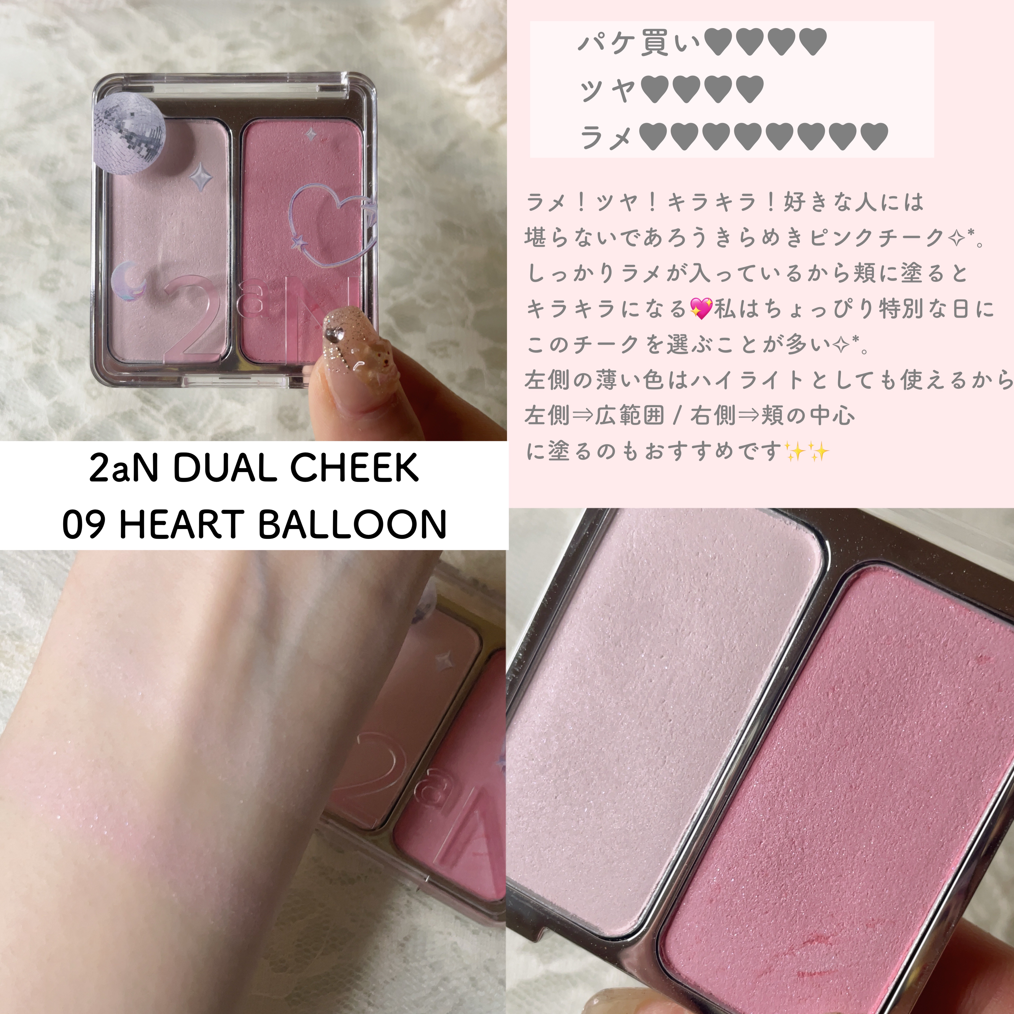 あまりにも可愛すぎてずっと見てられる パッケージ😭🎀 ラメ感が強めで頬がキラキラになります デイリー使いだとマットチークと組み合わせてラメ感を少し抑えるのが個人的にはおすすめです💘 なによりパッケージが超絶可愛いから持ってるだけでテンションが上がる⤴️⤴️⤴️