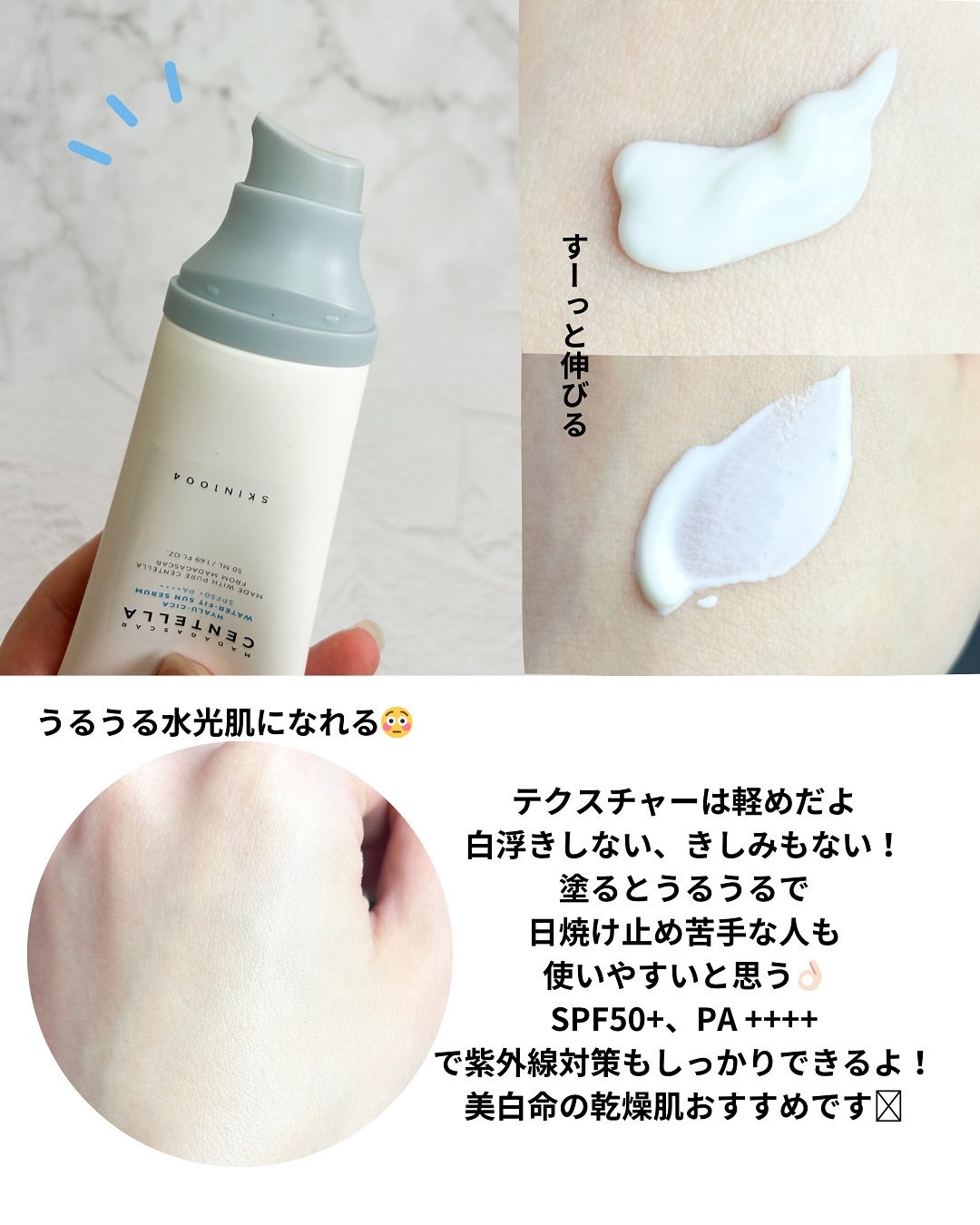 この夏もリピした日焼け止め◇skin1004◇☑︎ヒアルーシカウォーターフィットサンセラム色がほとんどつかないので顔にも身体にも使いやすくて特に腕や首メインで使用しています𖧷みずみずしくてセラムのようなテクスチャで白浮きやムラにもなりに...