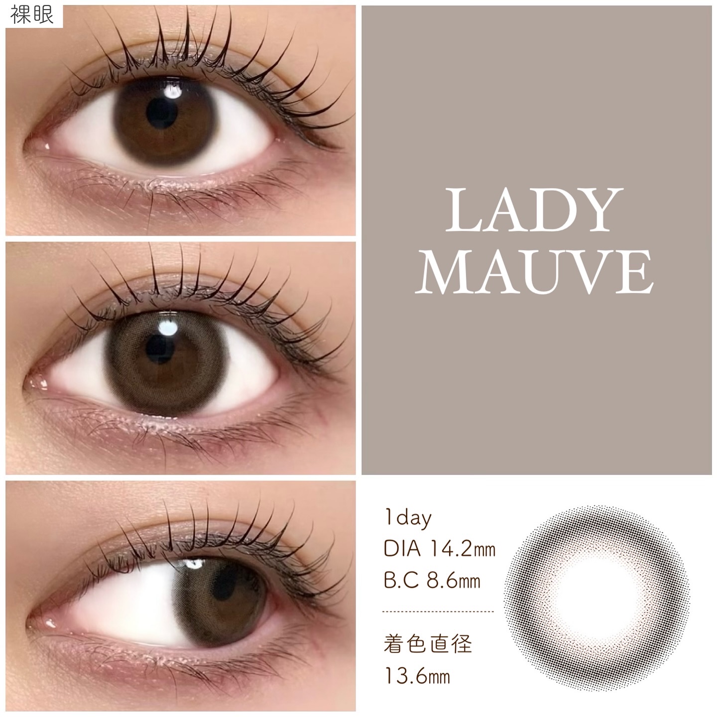 - ※2025年6月以降、商品パッケージ裏面・側面の一部表記を順次変更いたします。尚、これにかかる商品の交換・返品は承っておりません。 <クラシックブラウン> 奥行きのあるデザインとくっきりフチが程よく瞳を強調。 光沢感のあるダークカラーで重たくならず、品格のある洗練された瞳に。 <セピアムード> 細フチデザインが瞳の輪郭をさりげなく強調。 溶け込むようなベージュカラーで、上品な抜け感のある印象に。 <ムーンブラウン> ベーシックに日常生活に溶け込む色素薄い系レンズ。 ニュアンスブラウンカラーが抜け感を演出し、洗練された大人カジュアルな印象に。 <レディモーヴ> 細フチデザインが瞳の輪郭をさりげなく強調。 溶け込むようなベージュカラーで、上品な抜け感のある印象に。 カラーコンタクトレンズの不適正使用による眼障害の危険性等などがあります。 ●コンタクトレンズは高度管理医療機器です。不十分な洗浄・消毒など不適切なケアや、長時間・交換期間を超えた装用により、アレルギー性結膜炎、角膜感染症、角膜潰瘍等の重篤な眼障害が発生する危険性があります ●ご使用前に取扱説明書を確認してください 使用上の留意事項 ●眼科医院等を受診してからお求めください ●眼に異常を感じたら直ちにレンズ使用を中止し、お近くの眼科等で診察を受けてください ●医師の指示にしたがってご使用ください ●コンタクトレンズを装用する場合、自覚症状がなくても、眼科医院等での定期検査を受けてください ●レンズに不具合がある場合は使用しないでください