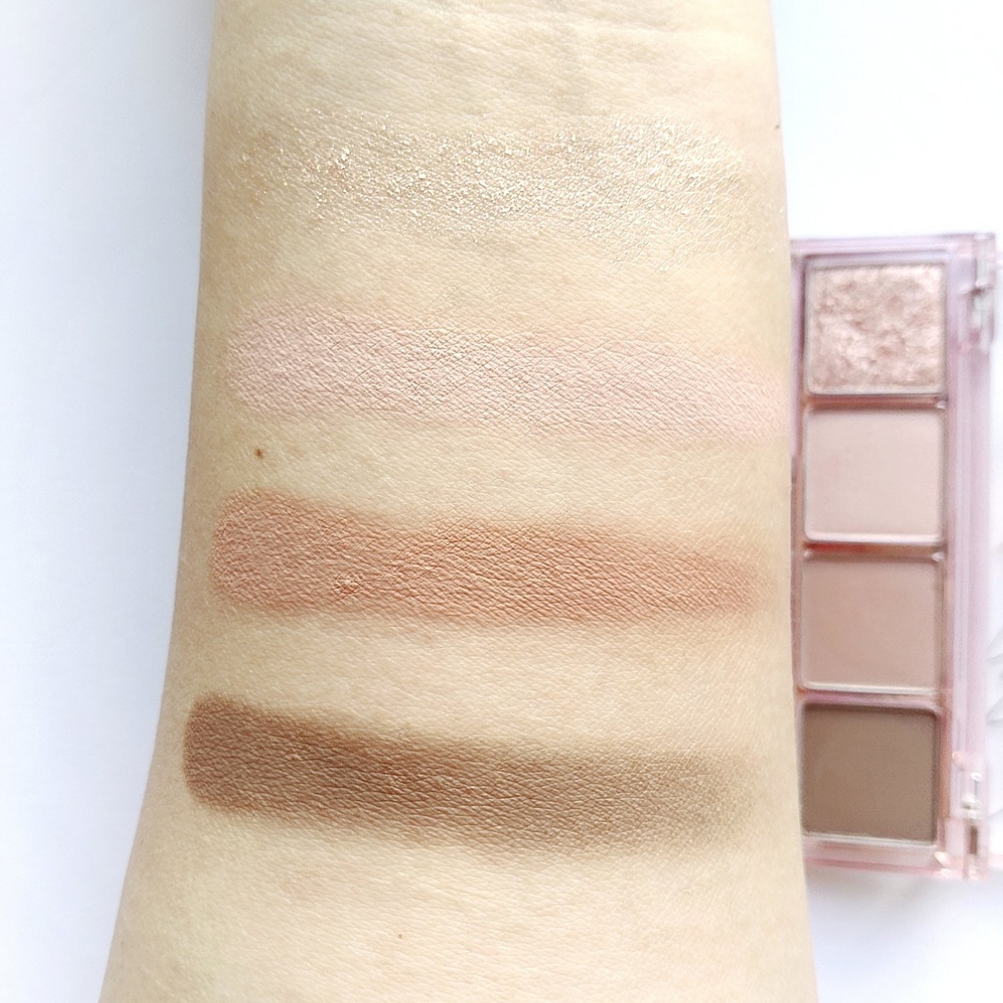 プチプラのクオリティじゃないっ!! 発売前からチェックしていたけれど、ここまで可愛いとは…😆 絶妙カラーで目もとのくすみを飛ばして*明るい印象に🩷 横割りグラデーションでメイクし、立体感をより出したかったので最後に1番左のカラーを上まぶたの真ん中と涙袋にのせています🙆 肌馴染みも良くて粉飛びも感じにくかったです💕 ブラウンの方も店頭に出てたら買おうかな💓
