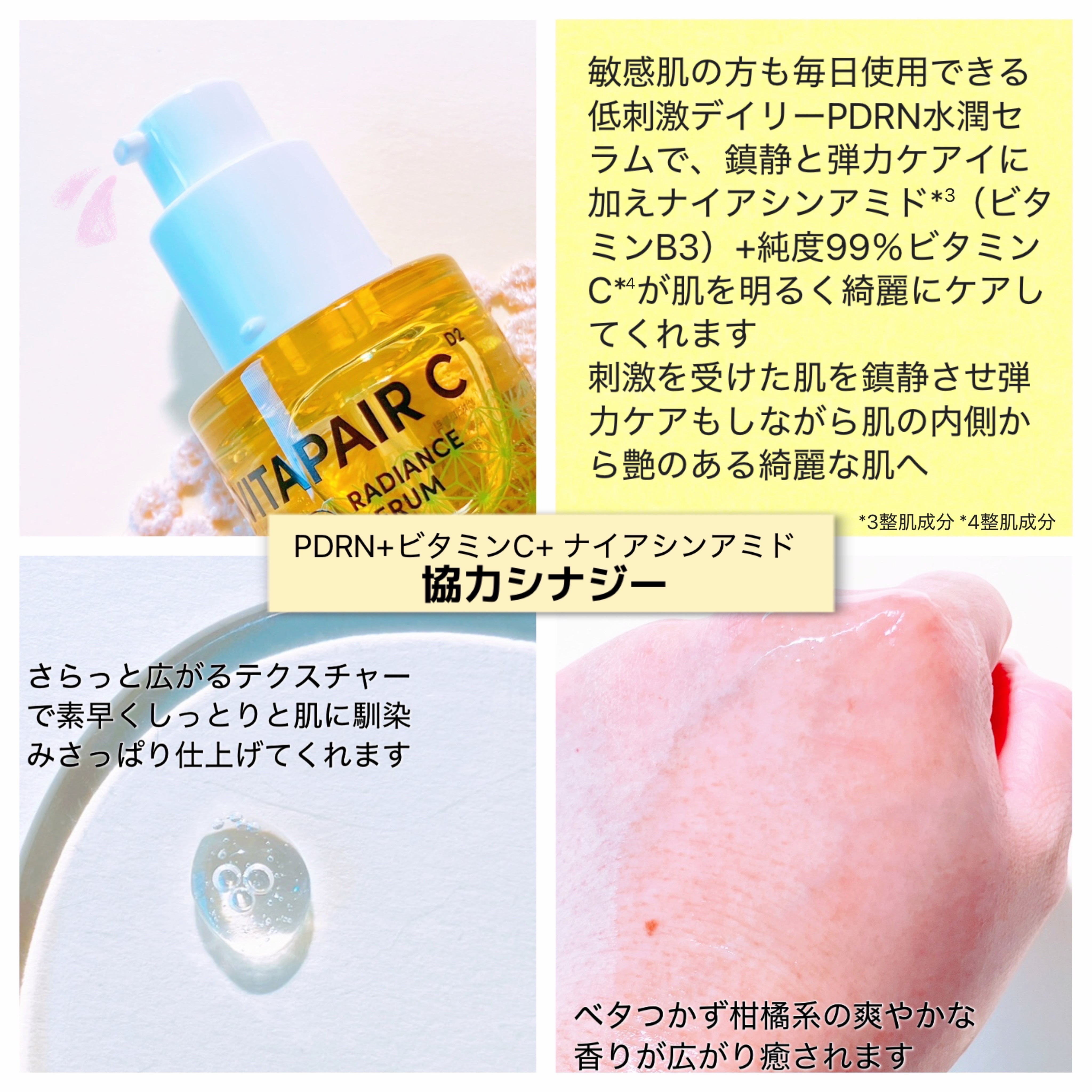 - センテラPDRNとビタミンC成分により敏感肌や荒れたお肌をやさしく鎮静しながら、温泉上がりのような透明感と潤いをプラス。 さらにナイアシンアミドや、済州グリーンレモン水※1でくすみやシミをケアし、健やかな肌へと導きます。 高濃度なスキンケアが苦手な方や敏感肌の方でも毎日使いやすい、デイリーケアにぴったりの低刺激セラムです。 【こんな方におすすめ】 ・お肌のハリや弾力が気になる方 ・敏感肌で高濃度製品を使用することに抵抗がある方 ・毎日続けられて着実にお肌の潤いと弾力ケアができる商品を探している方