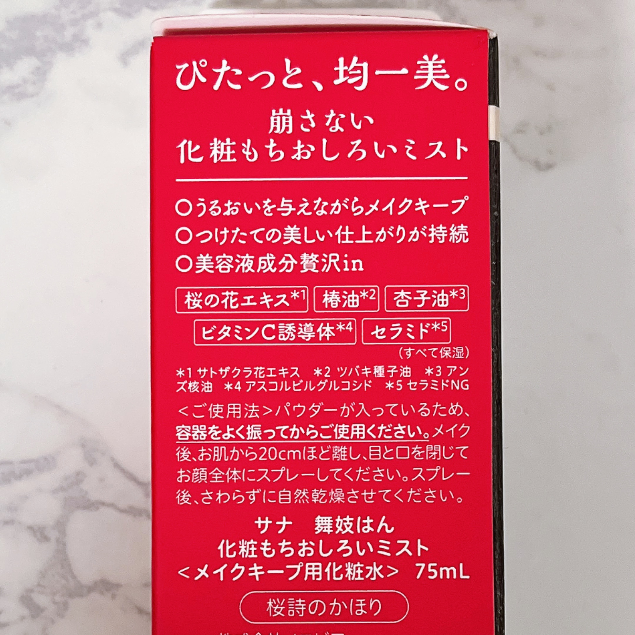 - <崩さない×乾かない!うるさらメイクコート処方> ・さらさらおしろい層 毛穴ぼかしパウダー※11で均一なお肌に見せながら、皮脂吸着パウダー※12でさらりとべたつき知らずに仕上げます。 ・うるおい化粧水層 メイクコート成分※13と美容液成分配合でお肌にうるおいのヴェールを作りながら、メイクをキープします。 <美容液成分贅沢in> 桜の花エキス※3、椿油※4、杏子油※5、ビタミンC誘導体※14、セラミド※15(すべて保湿) <微細ミストでふんわりまとえる> 細かな霧状ミストのため、ムラなくふんわりまとえて、お肌にすっとなじみます。 ふわっと香る、桜詩のかほりで心地よく使えます。 ※3 サトザクラ花エキス ※4 ツバキ種子油 ※5 アンズ核油 ※11 炭酸Ca ※12 セルロース ※13 プルラン ※14 アスコルビルグルコシド ※15 セラミドNG