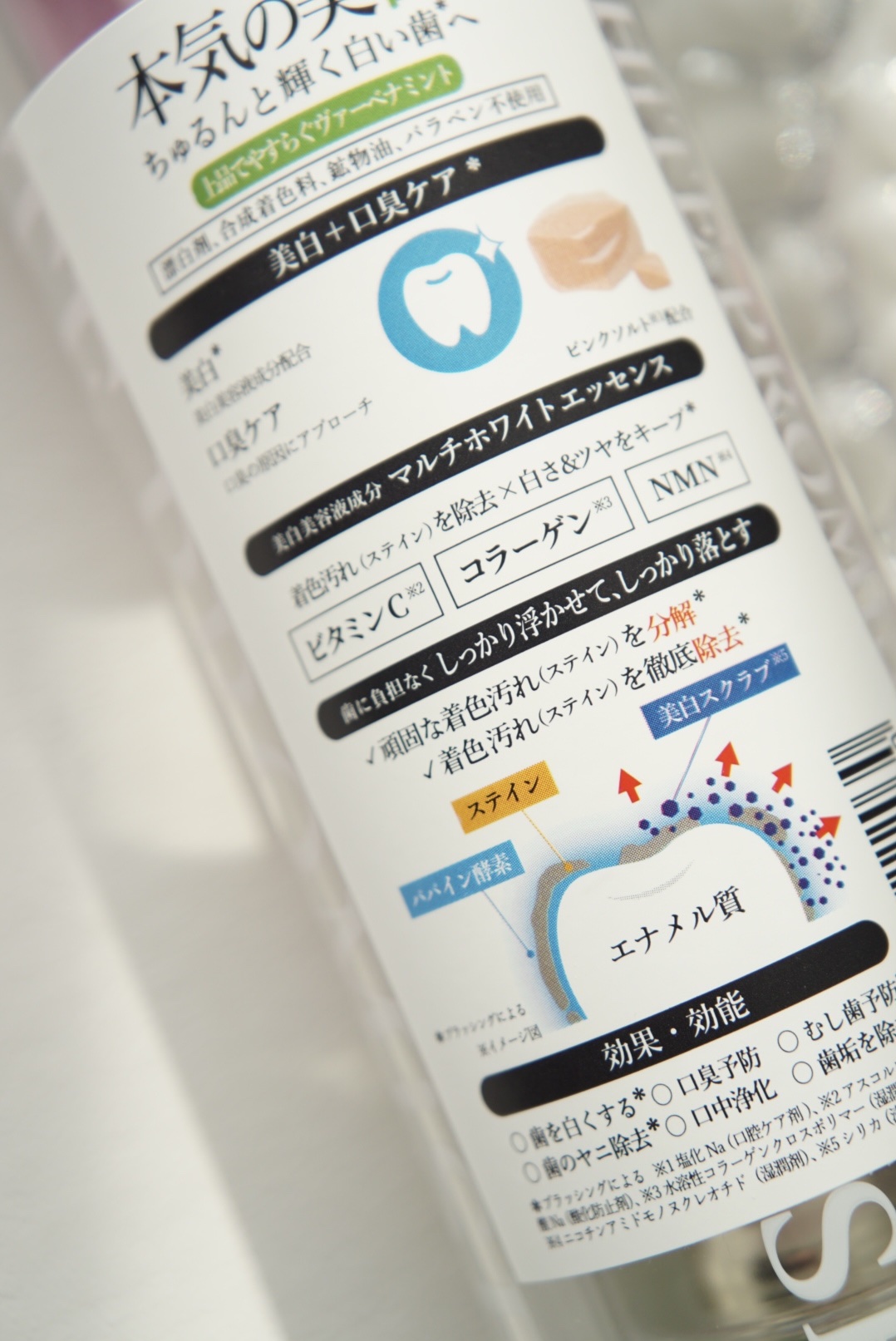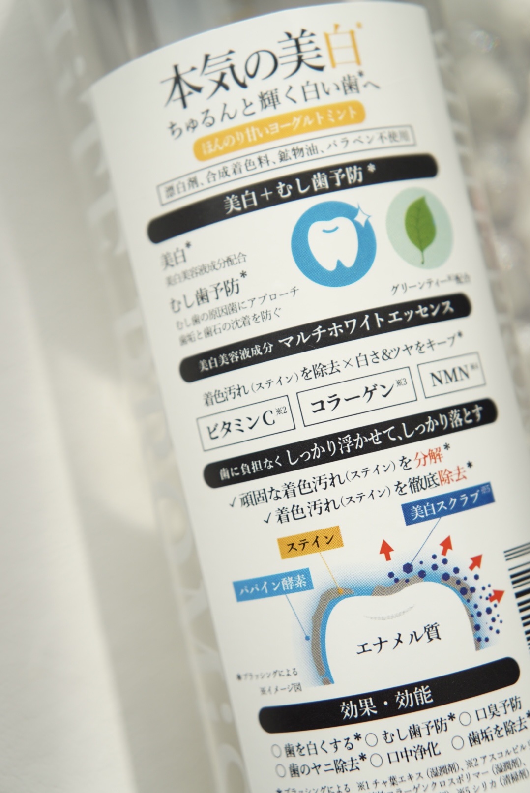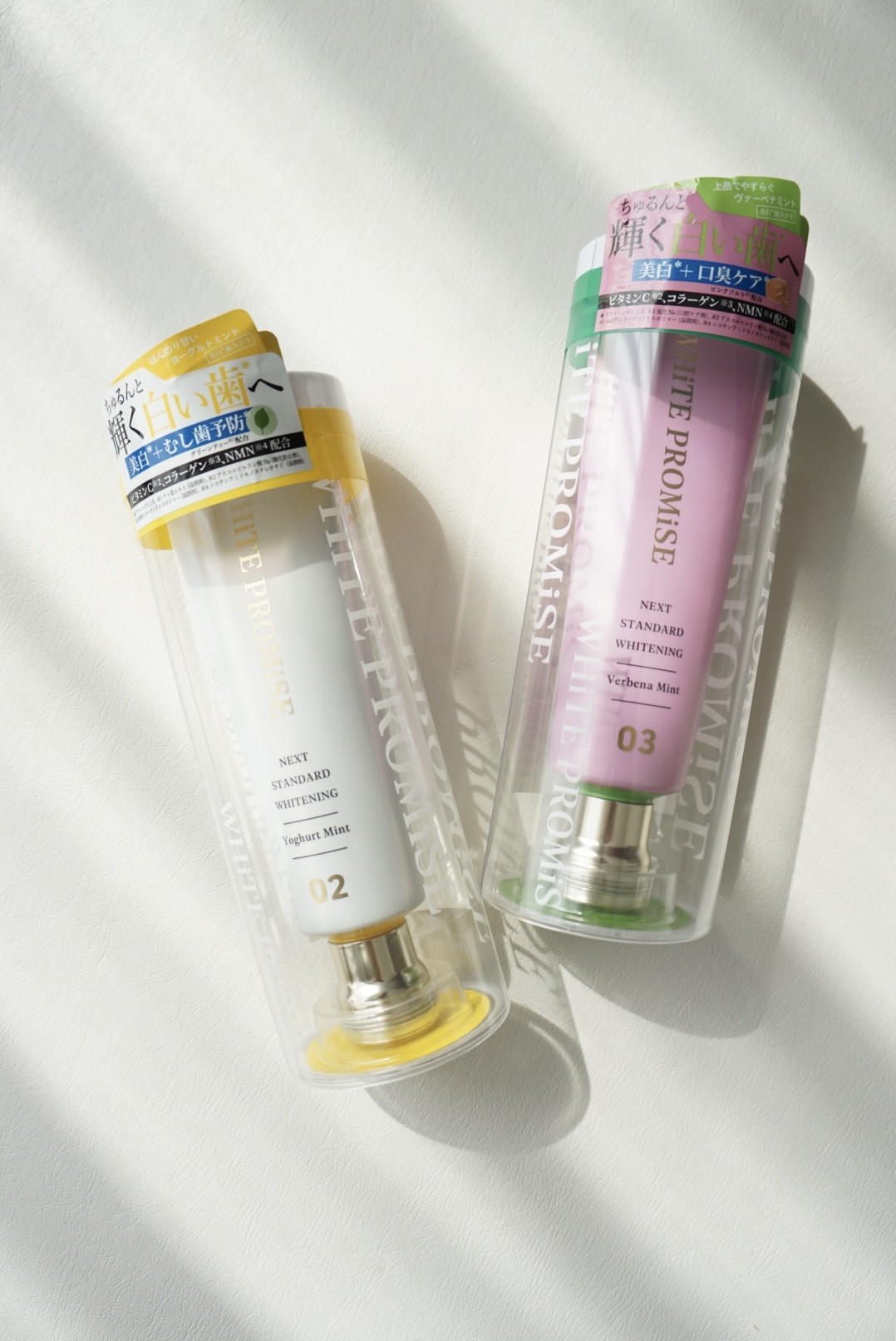 WHiTEPROMiSE#02ヨーグルトミント、#03ヴァーベナミントを使用しました。今までにない、”新”美容液発想の美白*歯みがき。ビタミンC*1・コラーゲン*2・NMN*3など、美容液成分が配合されているという、美白*美容液発想の新感覚歯...