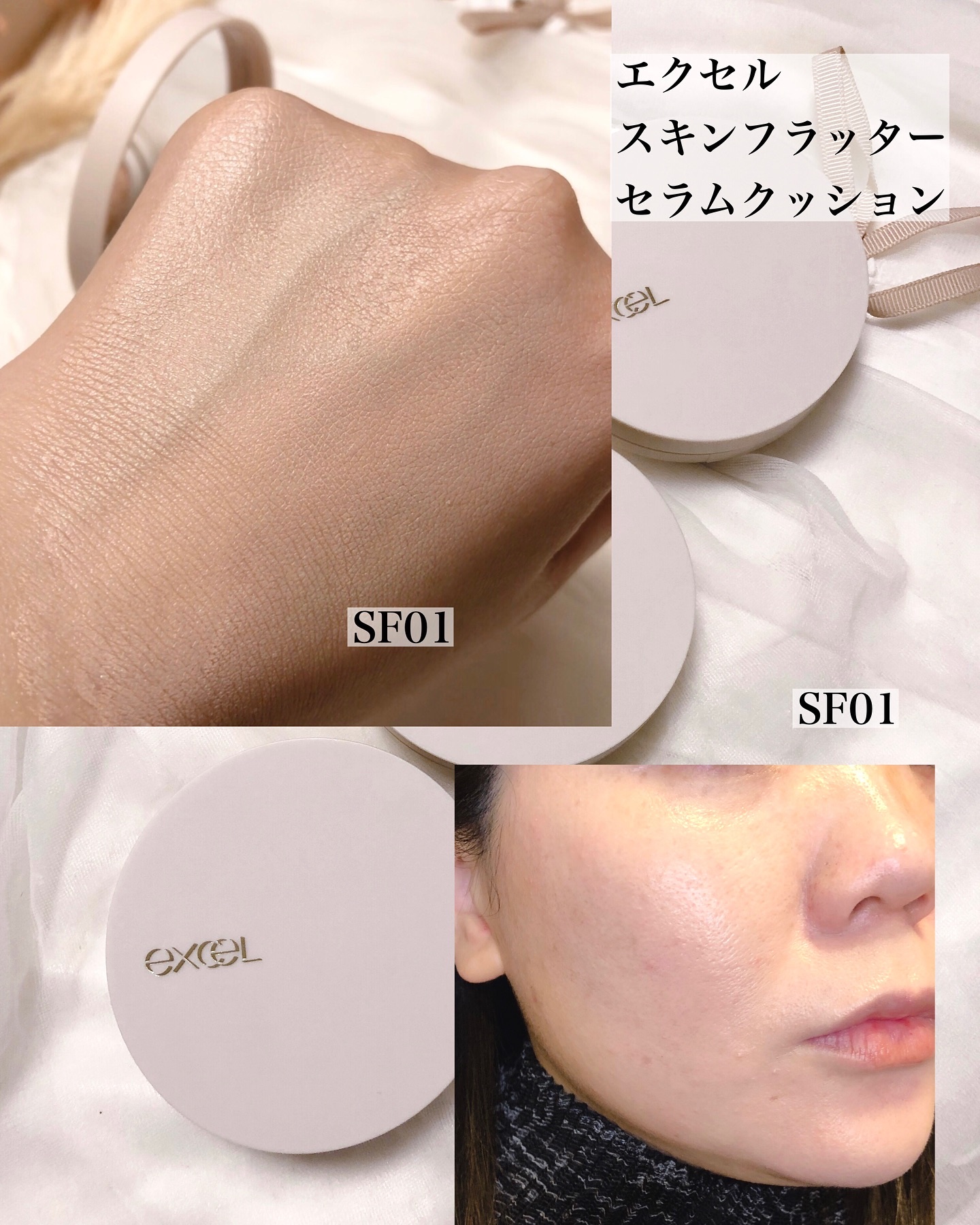 エクセルの美容液クッションファンデ全色レビュー❤️🍀エクセルスキンフラッターセラムクッションSPF50+PA++++全3色SF01ライトベージュSF02ミディアムベージュSF03ナチュラルベージュ各3,410円(税込)常盤薬品工業様から素...