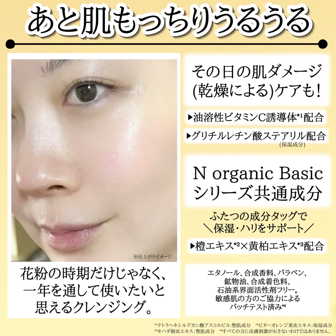 - 1.花粉をジェルオイルでくるみ”花粉爆発”を防いですすぎ落とす 花粉は、固い細胞膜の中にアレルギー物質を内包しています。 花粉は水となじみやすく、水に触れるとふやけて細胞膜に亀裂が入り、中のアレルギー物質を放出してしまいます。 これが花粉爆発の正体。 「N organic Basic スージング クレンジングジェル」はオイルと少量の水をネットワーク化した崩壊性ジェル構造。 肌に広げるわずかな力で崩壊して、花粉を吸着した水をオイルで包み、短時間でさっと洗い上げます。 2.ミクロの汚れも逃さないWクレンズ処方 メイクはもちろん、花粉やホコリ・黄砂などの大気汚れ、皮脂、古い角質、角栓といった5大汚れを一掃すべく、ふたつのクレンズ機能を採用しました。 ・ブラッシングクレンズ※1 廃棄される四国産伊予柑の外皮を再利用した、サステナブル原料のナノファイバー。 毛穴の1万分の1のサイズの極小繊維状構造で、細かい汚れもブラッシングするように浮き上がらせます。 ・マグネットクレンズ※2 アロエベラ葉エキス、ビオフラボノイド、ブロッコリーエキスという3種の植物エキスからなる複合成分。 ブラッシングクレンズで浮かせた細かい汚れを磁石のように引き寄せて凝集させ、落としやすくします。 ※1 イヨカン果皮エキス(洗浄補助成分) ※2 アロエベラ葉エキス、ビオフラボノイド、ブロッコリーエキス(洗浄補助成分) 3.その日のダメージをケアする油溶性のスキンケア成分配合 すでに受けてしまったダメージ※1をケアするため、ビタミンC誘導体※2、グリチルレチン酸ステアリル※3、2種類の油溶性スキンケア成分を配合しました。 また、N organic Basic共通成分の橙エキス※4・黄柏エキス※5も配合しております。 ※1乾燥による ※2 テトラへキシルデカン酸アスコルビル:整肌成分 ※3 グリチルレチン酸ステアリル:保湿成分 ※4 ビターオレンジ果皮エキス(保湿成分) ※5 黄柏エキス:キハダ樹皮エキス(整肌成分) 4.「N organic Basic」シリーズに共通のスウィートシトラスの香り 柑橘やクスノキを中心に、果実や植物から抽出しブレンドした5種類の100%精油にこだわった、「N organic Basic」シリーズ共通のスウィートシトラスの香りです。 落としている間はふんわりと香りに包まれて、すすいだ後には残りません。 <販売スケジュール> ・2025年1月18日(土) 「N organic」会員・直営店※1 先行発売開始 ・2025年2月12日(水) 「N organic」公式サイト・楽天市場店予約販売開始 ・2025年3月1日(土) ロフト先行発売開始※2 ・2025年3月12日(水) 本発売開始 ※1 有楽町マルイ店、日本橋髙島屋S.C.店、テラスモール湘南店、北千住マルイ店、タカシマヤ ゲートタワーモール店 ※2 一部ロフト店舗ではお取り扱いしておりません。