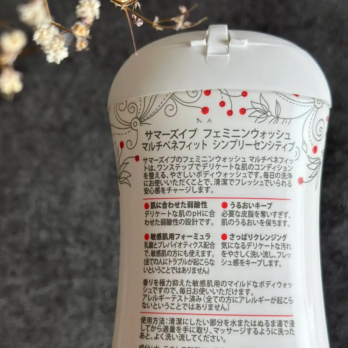 - 肌に優しい使い心地のデリケートゾーン用ボディウォッシュです。デリケートな肌phに合わせてつくられた弱酸性設計。「マルチベネフィット デイリーバランス」よりも、さらに穏やかな処方でつくられた敏感肌用で、香りも抑えめです。潤いをキープしながら、気になるデリケートな汚れをさっぱりクレンジングします。 デリケートゾーンのニオイ*やムレ、カサツキなどに悩まれている方にもおすすめです。 *古い角質や汚れによる 【日米話題のデリケートゾーンケアブランド】 Summer’s Eve(サマーズイブ)は、アメリカで生まれたデリケートゾーンケアブランドです。1972年から、フェムテック分野のパイオニアとして、世界30カ国以上で販売しています。日本での販売は2013年から。アメリカ、日本の両国でデリケートゾーンケアの売上シェア1位*を獲得しています。 *IRI Market Advantageデータ 米国婦人衛生用品ブランド別金額シェア2020年12月調べ(12カ月計) *富士経済「美容家電・化粧雑貨マーケティングトレンドデータ2018」マーケットシェア、デリケートゾーン用洗浄・シート市場、金額ベース、2016年実績 【専門機関による各種テストを実施】 安全性使用テストを発売前にすべての製品で実施 ③パッチテスト*:専門機関監修のもと、一定期間使用し、肌にアレルギー症状が出ないかテスト済 ④エチケット効果テスト:サマーズイブを使用してエチケット対策の変化に関するテストを実施 *すべての方にアレルギーや刺激が起こらないわけではありません。