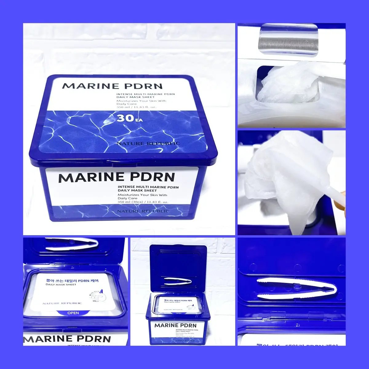 ネイチャーリパブリックマリンPDRNデイリーシートマスク✨毎日使えるデイリーシートマスク🫧薄手のビーガン認証シートに海藻類由来のPDRNや5種類のペプチド+アデノシンが配合された美容液がヒタヒタに浸透していてお顔に超密着っ‼️私はこのタイプの...