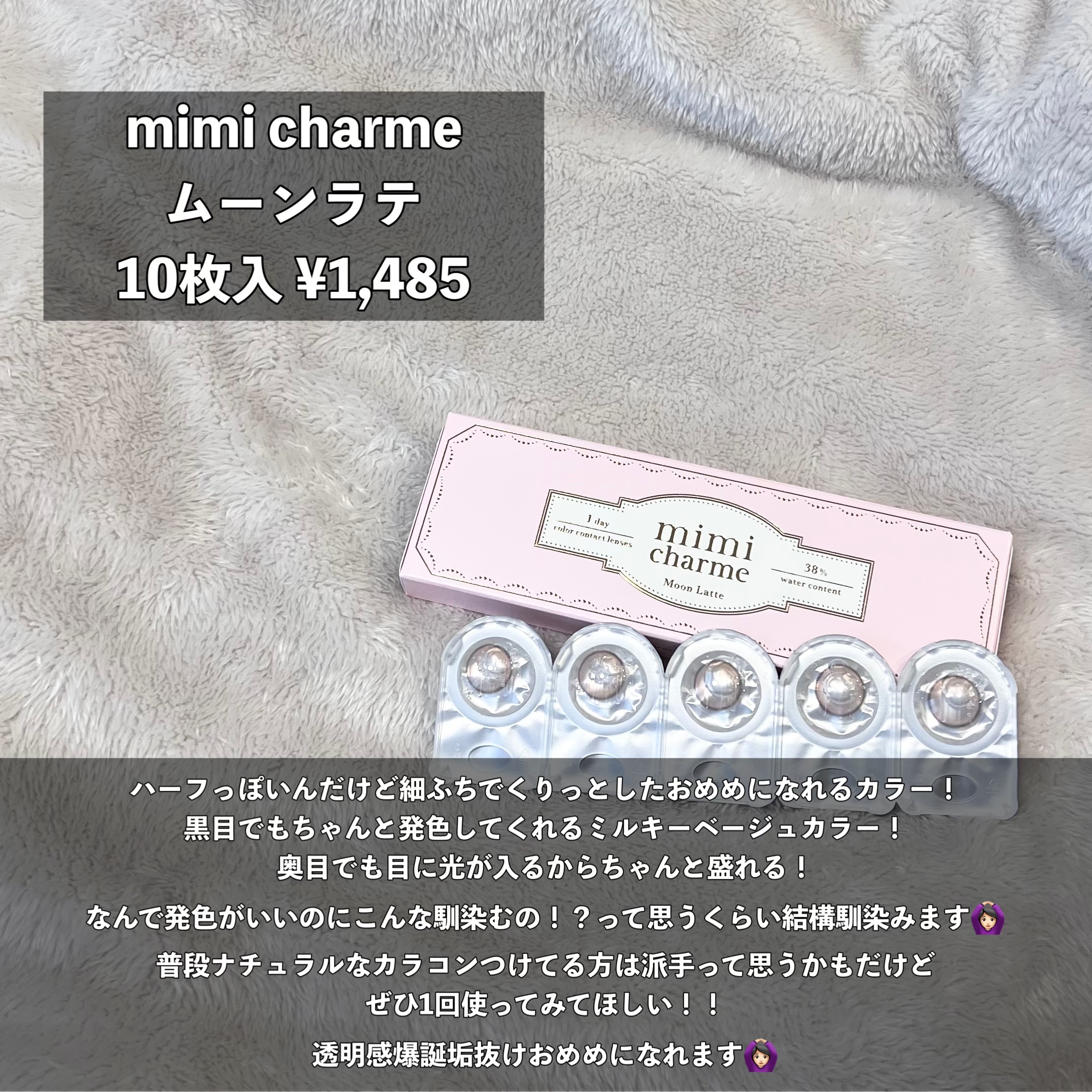 - 誰もが物語の主人公。 舞台の上でスポットライトを浴びているように瞳に魅力と光をまとわせ、毎日のわたしをより一層美しく輝かせる。 mimi charme(ミミシャルム)と一緒に物語の続きを。 <キティパフ> DIA14.2mm/着色直径13.8mm 太フチ無敵盛れ水光グレー あざと子猫ちゃんになれちゃう! 一軍太フチグレーレンズ <ジェムグレージュ> DIA14.2mm/着色直径13.5mm 細フチ大人っぽ水光グレージュ グレーなのにナチュラルでデイリー使いしやすい! <ドーリードロップ> DIA14.2mm/着色直径13.6mm 新感覚♡きゅるん盛れドーリーアイ 散りばめたブルーのハイライトがトレンド感満載! <ハニーシロップ> DIA14.2mm/着色直径13.5mm 細フチあざと水光ブラウン 新王道!垢抜け水光ブラウンレンズ <ムーンラテ> DIA14.2mm/着色直径13.0mm キラめき水光ミルキーベージュ オシャレな放射状ハイライトでまるで発光しているような瞳へ! <ロイヤルムーン> DIA14.2mm/着色直径13.0mm キラめき水光ミルキーグレー あの大人気カラームーンラテの色違い! 儚げうるみグレーレンズ カラーコンタクトレンズの不適正使用による眼障害の危険性等などがあります。 ●コンタクトレンズは高度管理医療機器です。不十分な洗浄・消毒など不適切なケアや、長時間・交換期間を超えた装用により、アレルギー性結膜炎、角膜感染症、角膜潰瘍等の重篤な眼障害が発生する危険性があります ●ご使用前に取扱説明書を確認してください 使用上の留意事項 ●眼科医院等を受診してからお求めください ●眼に異常を感じたら直ちにレンズ使用を中止し、お近くの眼科等で診察を受けてください ●医師の指示にしたがってご使用ください ●コンタクトレンズを装用する場合、自覚症状がなくても、眼科医院等での定期検査を受けてください ●レンズに不具合がある場合は使用しないでください