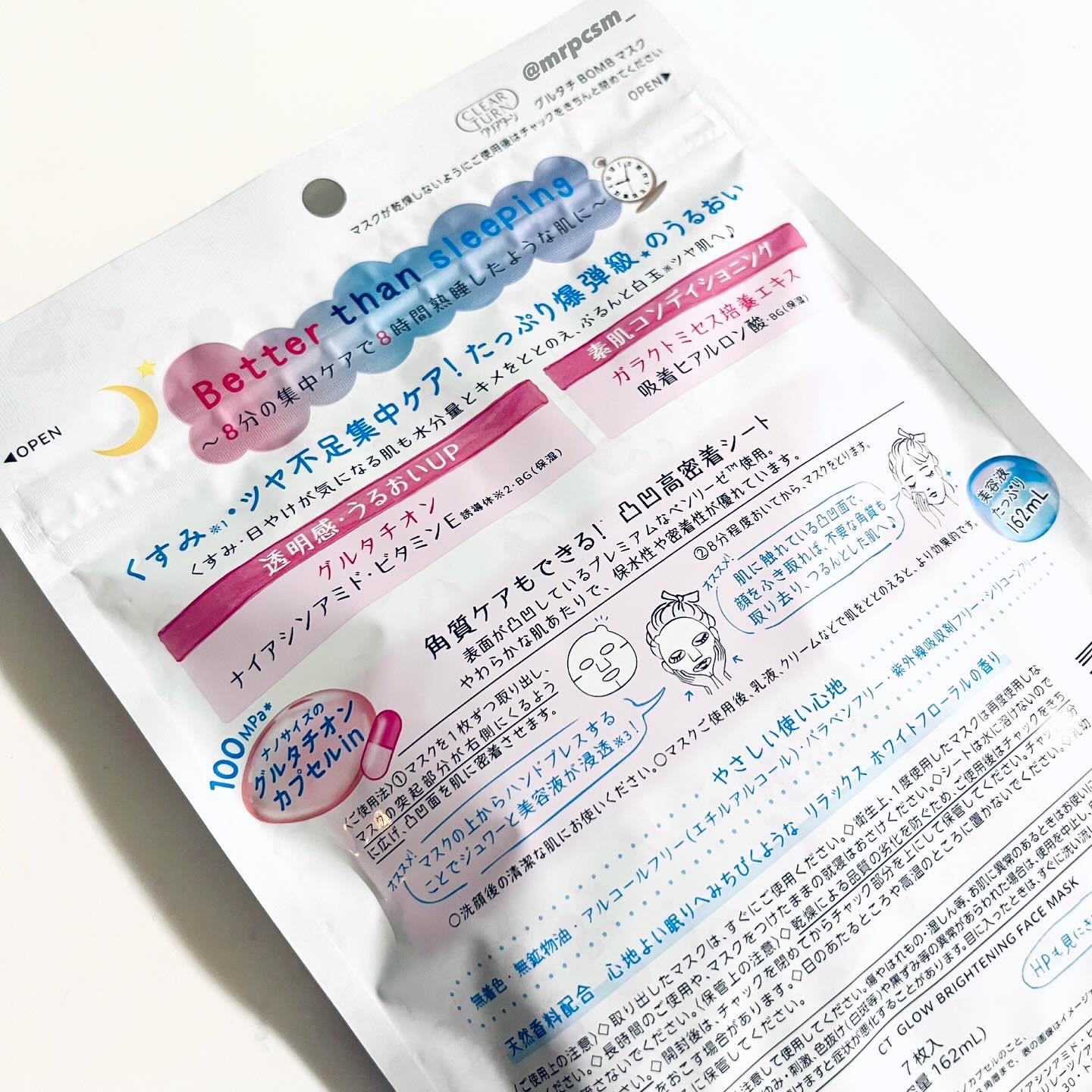 #PR#クリアターンクリアターンのBOMBシリーズにグルタチオンが新発売されました𓂃✍️商品名:クリアターン グルタチBOMBマスク容量:7枚入り・白玉※1ツヤ・透明感※2爆弾級★・透明感※2ケア成分配合 グルタチオン・ナイアシンアミド...