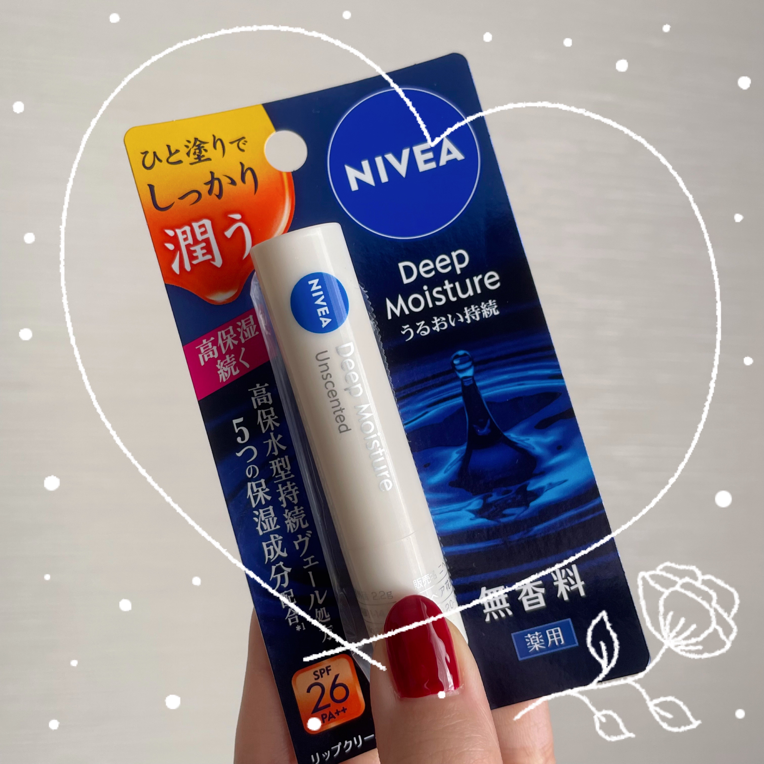 - 【医薬部外品】 ひと塗りでしっかり潤う。高保湿・ツヤ続くリップクリーム。 「高保水型持続ヴェール処方」で、うるおいが瞬時に広がり密着。保湿効果が続きます。 唇の荒れ、ひび割れを防ぎます。有効成分(ビタミンE・グリチルレチン酸ステアリル)配合。 紫外線から唇を守ります。 UVカット成分配合(SPF26/PA++)。