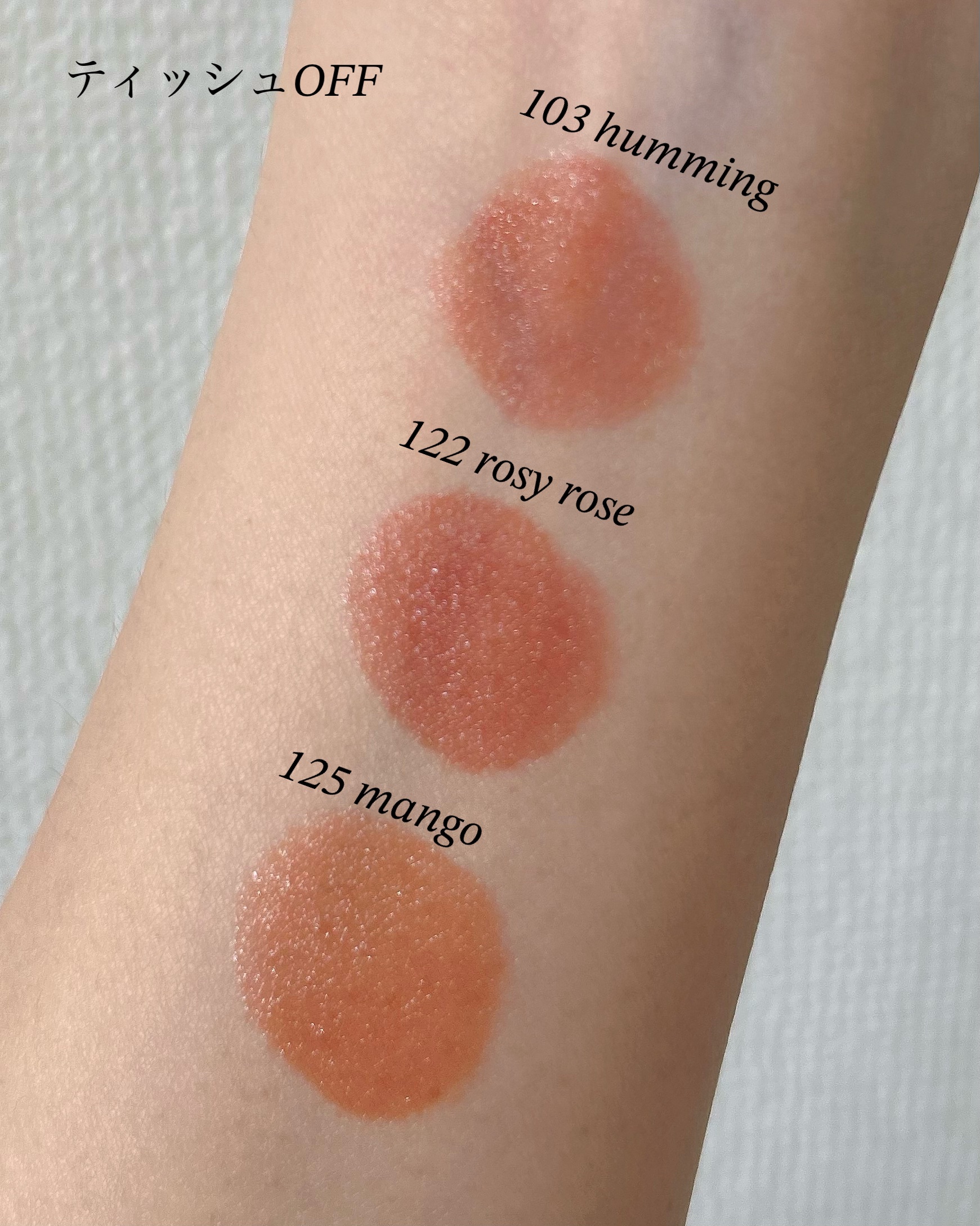 - <101 ジョイフル> 水、リンゴ酸ジイソステアリル、ダイマージリノール酸(フィトステリル/イソステアリル/セチル/ステアリル/ベヘニル)、ジイソステアリン酸ダイマージリノレイル、ノナイソステアリン酸ポリグリセリル-10、オクチルドデカノール、ビスジグリセリルポリアシルアジペート-2、水添ポリイソブテン、セチルPEG/PPG-10/1ジメチコン、ポリソルベート60(小麦由来)、イソステアリン酸ソルビタン(小麦由来)、1,2-ヘキサンジオール、グリセリン、ベヘニルアルコール、(アクリル酸/MA)コポリマーNa、ペンチレングリコール、BG、ポリアクリレート-13、トロメタミン、(アクリレーツ/アクリル酸アルキ ル(C10-30 )クロスポリマー、エチルヘキシルグリセリン、ポリイソブテン、(アクリル酸ヒドロキシエチル/アクリロイルジメチルタウリンNa)コポリマー、スクワラン、デヒドロ酢酸、ステビオシド、香料、フィチン酸、カプリリルグリコール、ジメチコン、水添ロジン酸メチル、水酸化Al、ポリソルベート20(小麦由来)、トコフェロール、ライム果汁、キイチゴ果汁、レモン果汁、マンゴー果汁、フラガリアチロエンシス果汁、アンズ果汁、オレンジ果汁、グレープフルーツ液汁、キウイ果汁、パパイア果汁、[+/-]酸化チタン、黄4、黄5、赤 104(1)、赤227、青1 <102 デューイ> 水、リンゴ酸ジイソステアリル、ダイマージリノール酸(フィトステリル/イソステアリル/セチル/ステアリル/ベヘニル)、ジイソステアリン酸ダイマージリノレイル、ノナイソステアリン酸ポリグリセリル-10、オクチルドデカノール、ビスジグリセリルポリアシルアジペート-2、水添ポリイソブテン、セチルPEG/PPG-10/1ジメチコン、ポリソルベート60(小麦由来)、イソステアリン酸ソルビタン(小麦由来)、1,2-ヘキサンジオール、グリセリン、ベヘニルアルコール、(アクリル酸/MA)コポリマーNa、ペンチレングリコール、BG、ポリアクリレート-13、トロメタミン、(アクリレーツ/アクリル酸アルキル(C10-30))クロスポリマー、エチルヘキシルグリセリン、ポリイソブテン、(アクリル酸ヒドロキシエチル/アクリロイルジメチルタウリンNa)コポリマー、スクワラン、デヒドロ酢酸、ステビオシド、香料、フィチン酸、ジメチコン、水添ロジン酸メチル、水酸化Al、カプリリルグリコール、ポリソルベート20(小麦由来)、トコフェロール、ライム果汁、キイチゴ果汁、レモン果汁、マンゴー果汁、フラガリアチロエンシス果汁、アンズ果汁、オレンジ果汁、グレープフルーツ液汁、キウイ果汁、パパイア果汁、酸化チタン、赤227、黄5、黄4、青1 <103 ハミング> 水、リンゴ酸ジイソステアリル、ダイマージリノール酸(フィトステリル/イソステアリル/セチル/ステアリル/ベヘニル)、ジイソステアリン酸ダイマージリノレイル、ノナイソステアリン酸ポリグリセリル-10、オクチルドデカノール、ビスジグリセリルポリアシルアジペート-2、水添ポリイソブテン、セチルPEG/PPG-10/1ジメチコン、ポリソルベート60(小麦由来)、イソステアリン酸ソルビタン(小麦由来)、1,2-ヘキサンジオール、グリセリン、ベヘニルアルコール、(アクリル酸/MA)コポリマーNa、ペンチレングリコール、BG、ポリアクリレート-13、トロメタミン、(アクリレーツ/アクリル酸アルキル(C10-30))クロスポリマー、エチルヘキシルグリセリン、ポリイソブテン、(アクリル酸ヒドロキシエチル/アクリロイルジメチルタウリンNa)コポリマー、スクワラン、デヒドロ酢酸、ステビオシド、香料、フィチン酸、ジメチコン、水添ロジン酸メチル、水酸化Al、カプリリルグリコール、ポリソルベート20(小麦由来)、トコフェロール、ライム果汁、キイチゴ果汁、レモン果汁、マンゴー果汁、フラガリアチロエンシス果汁、アンズ果汁、オレンジ果汁、グレープフルーツ液汁、キウイ果汁、パパイア果汁、酸化チタン、黄5、赤227、青1 <104 チェリー> 水、リンゴ酸ジイソステアリル、ダイマージリノール酸(フィトステリル/イソステアリル/セチル/ステアリル/ベヘニル)、ジイソステアリン酸ダイマージリノレイル、ノナイソステアリン酸ポリグリセリル-10、オクチルドデカノール、ビスジグリセリルポリアシルアジペート-2、水添ポリイソブテン、セチルPEG/PPG- 10/1ジメチコン、イソステアリン酸ソルビタン(小麦由来)、ポリソルベート60(小麦由来)、1,2-ヘキサンジオール、グリセリン、ベヘニルアルコール、(アクリル酸/MA)コポリマーNa、ペンチレングリコール、BG、ポリアクリレート-13、ト ロメタミン、(アクリレーツ/アクリル酸ア ルキル(C10-30))クロスポリマー、エチルヘキシルグリセリン、ポリイソブテ ン、(アクリル酸ヒドロキシエチル/アクリ ロイルジメチルタウリンNa)コポリマー、スクワラン、デヒドロ酢酸、ステビオシド、香料、カプリリルグリコール、ポリソルベー ト20(小麦由来)、トコフェロール、ライム果汁、キイチゴ果汁、レモン果汁、マンゴー 果汁、フラガリアチロエンシス果汁、アンズ 果汁、オレンジ果汁、グレープフルーツ液 汁、キウ