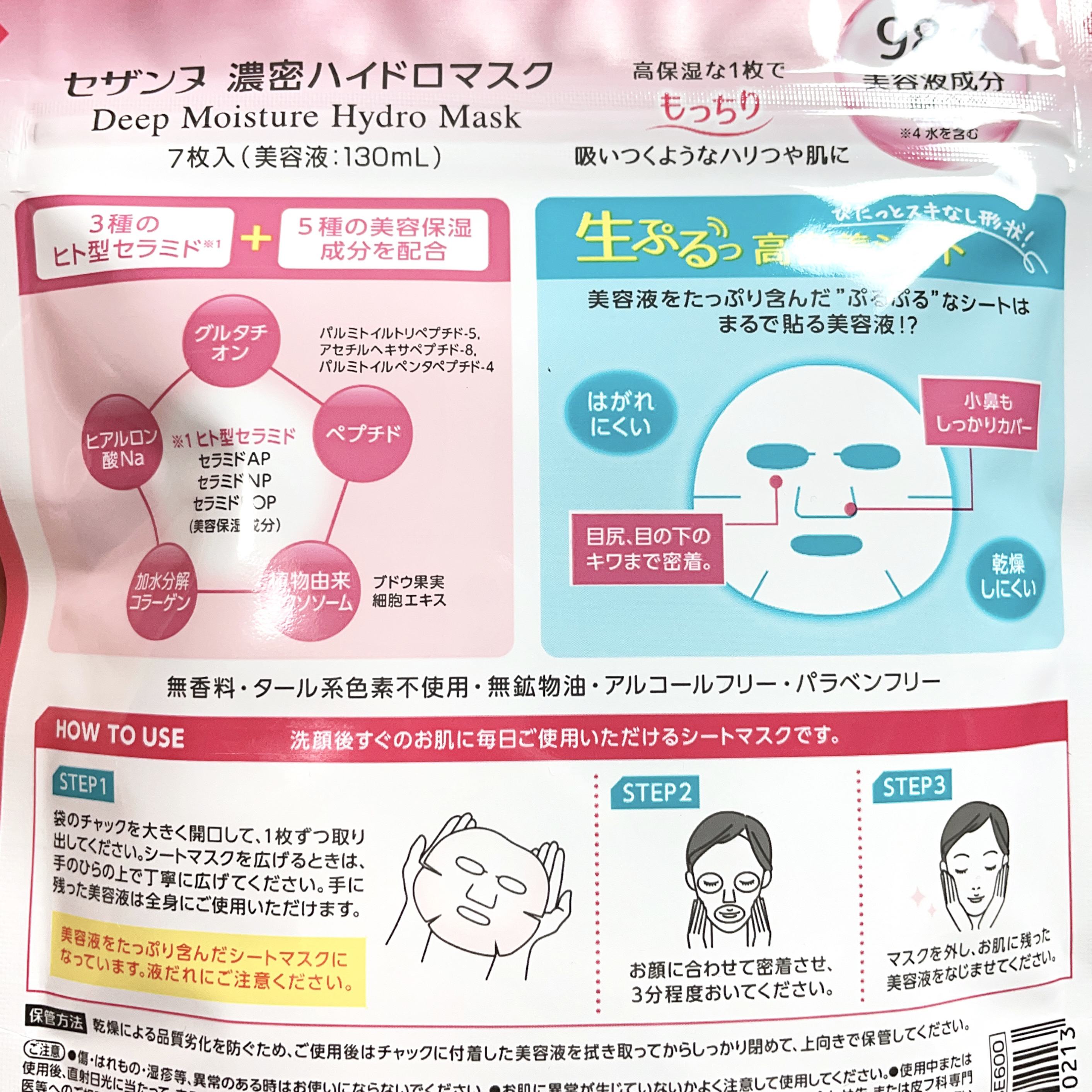 - 生ぷるっ質感の高保湿シートマスク。 うるおい続く「生ぷるっ」高密着シート。美容液をたっぷり含んだぷるぷるなシートはまるで貼る美容液!?乾燥しにくく、はがれにくい。 3種のヒト型セラミド※1と5種の美容保湿成分(植物由来エクソソーム※2、加水分解コラーゲン、ペプチド※3、ヒアルロン酸Na、グルタチオン)配合。 ※1 セラミドAP、セラミドNP、セラミドEOP(美容保湿成分) ※2 ブドウ果実細胞エキス ※3 パルミトイルトリペプチド-5、アセチルヘキサペプチド-8、パルミトイルペンタペプチド-4 目尻、目の下のキワまで密着し、小鼻もしっかりカバーするピタッとスキなし形状。 使用方法 袋のチャックを大きく開口して、1枚ずつ取り出してください。シートマスクを広げるときは、手のひらの上で丁寧に広げてください。手に残った美容液は全身にご使用いただけます。お顔に合わせて密着させ、3分程度おいてください。マスクを外し、お肌に残った美容液をなじませてください。 ※美容液をたっぷり含んだシートマスクになっています。液だれにご注意ください。