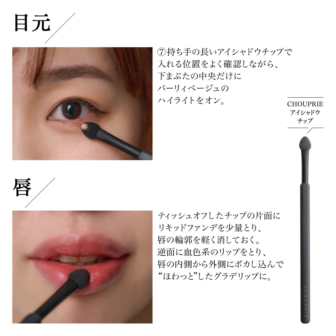 持ち手が長いから手で目もとが隠れず、 アイシャドウをのせたい位置を鏡でしっかり確認できて、 後々メイクが断然崩れにくい のに驚くはず。 たった一本のチップが、 あなたのメイクの“洗練度”を変える。