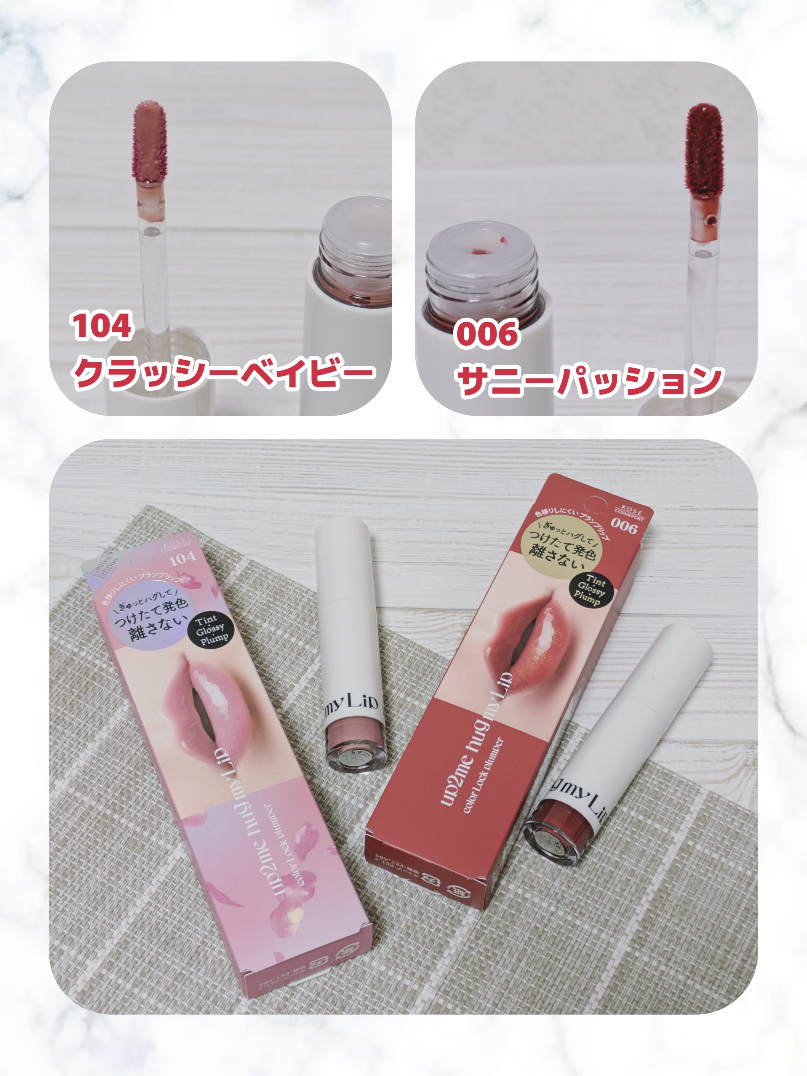 #PR#hugmylipアップトゥーミー ハグマイリップ カラーロックプランパーをお試ししました😊つやつやジェル膜がつけたての色を守り、きれい発色つづくプランプリップ。今回使用したカラーは006サニーパッション104クラッシーベイビーの2...