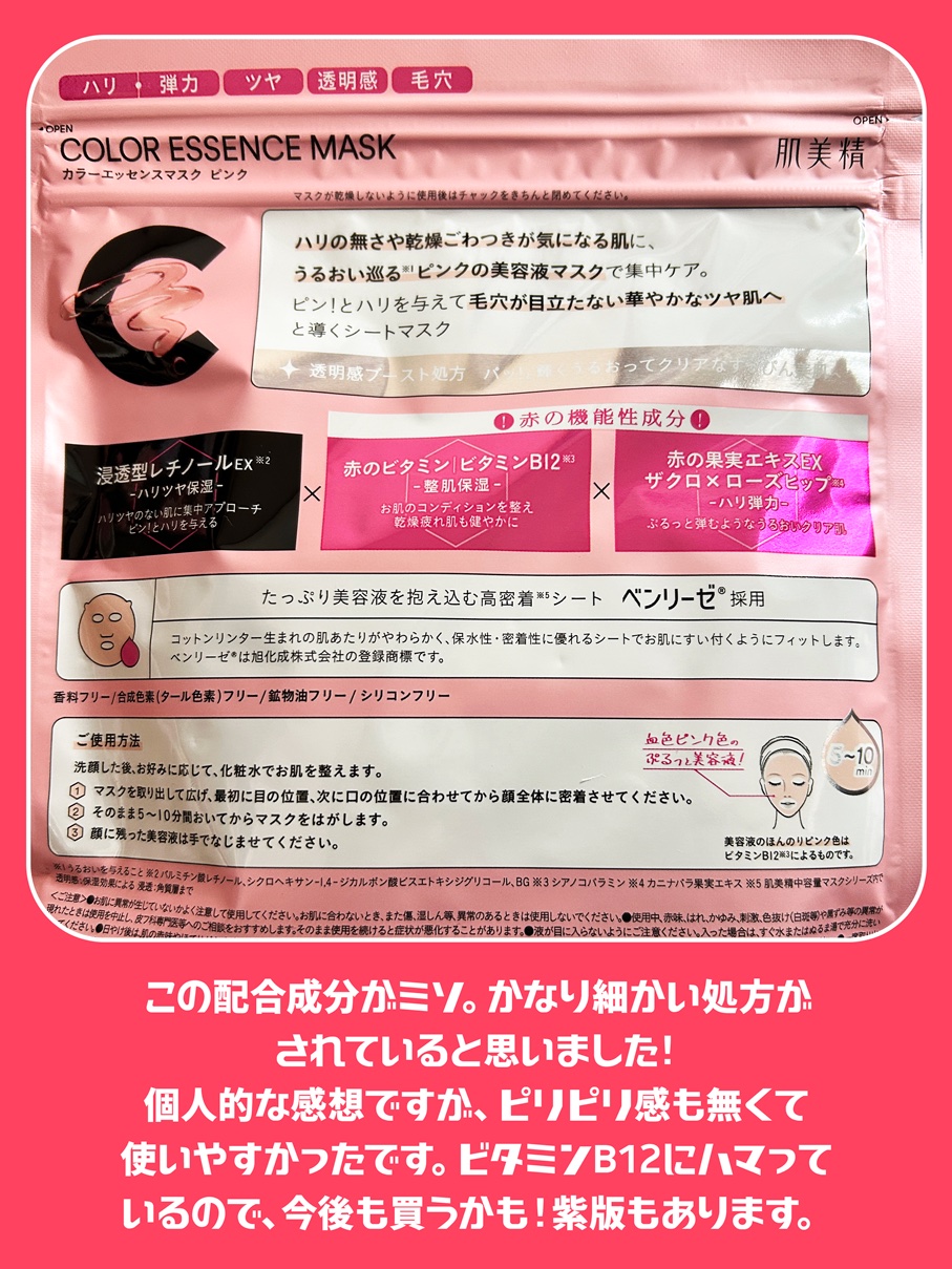 肌美精カラーエッセンスマスクピンクビタミンB12*¹由来のピンク色の美容液がマスクに浸されており、マスクもほんのりピンク色に!レチノール*²も配合で肌を整えてくれます。マスクのおでこ辺りに、少し突起があり、マスクがめくりやすくなっている工夫も...