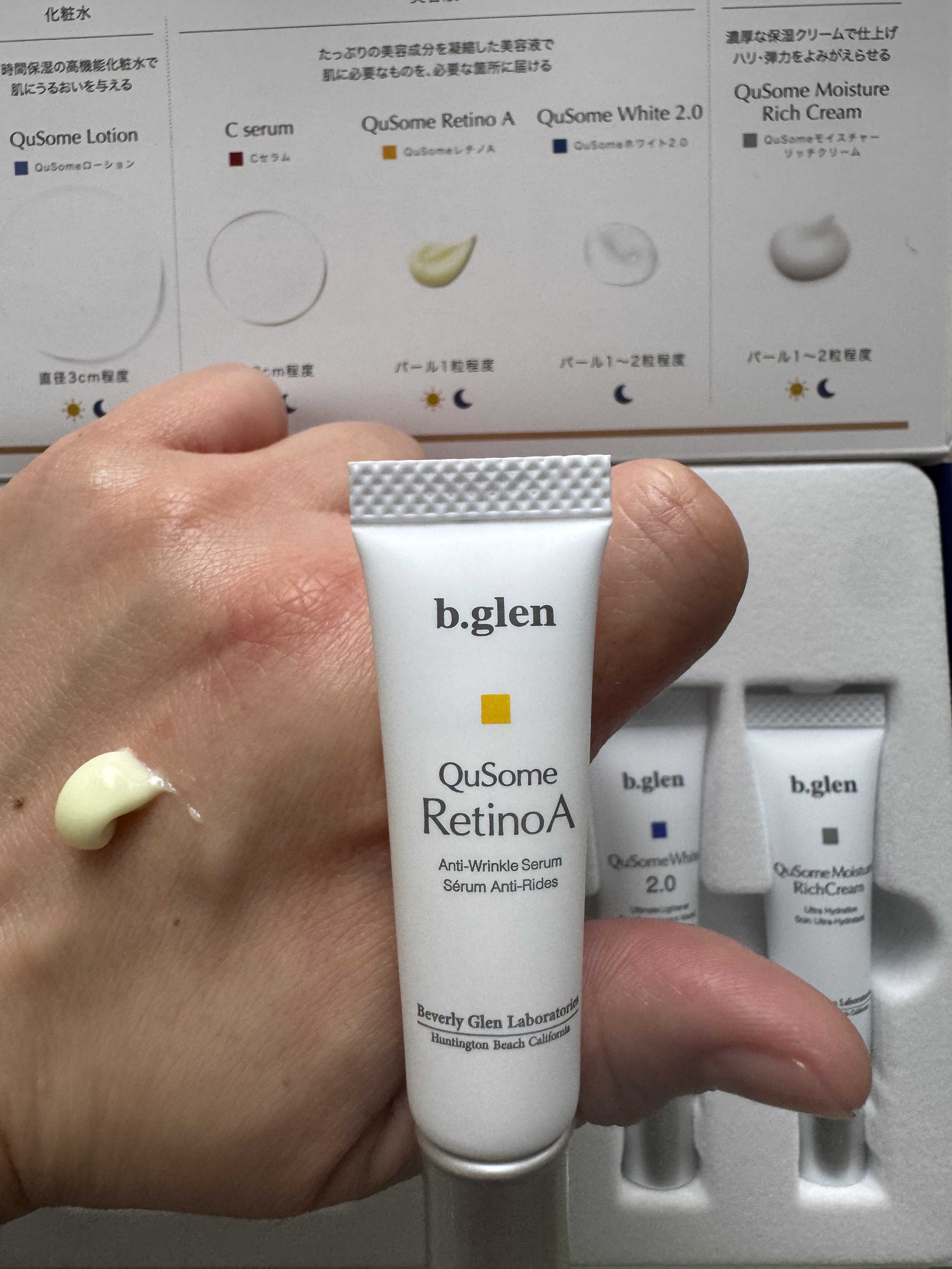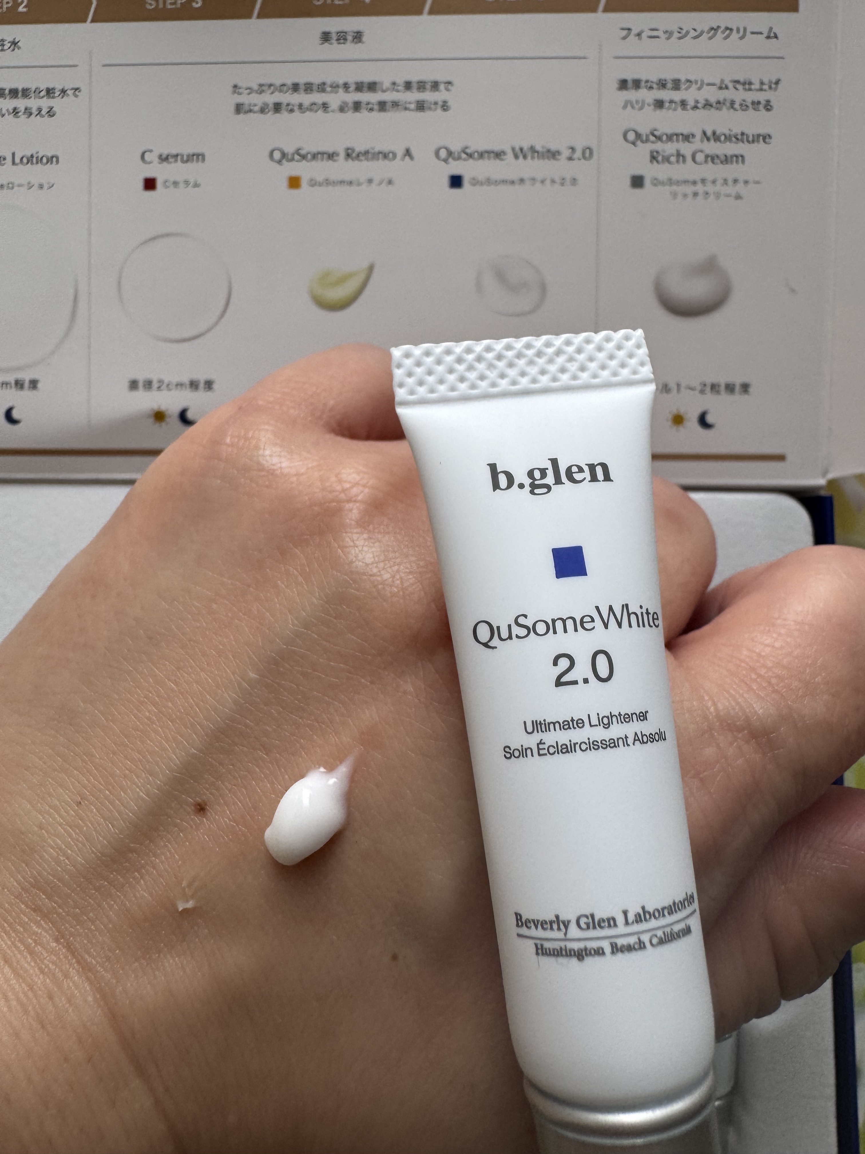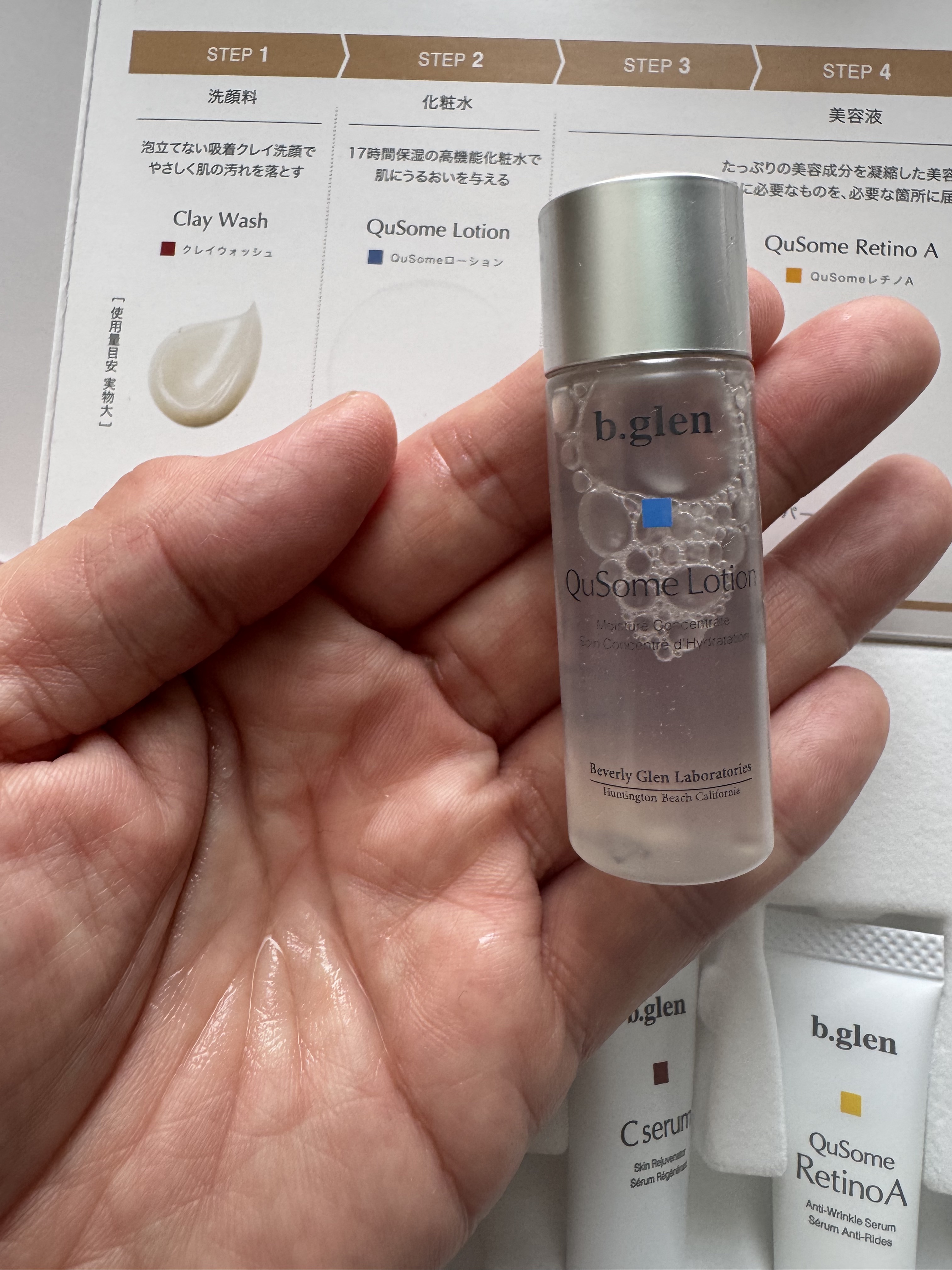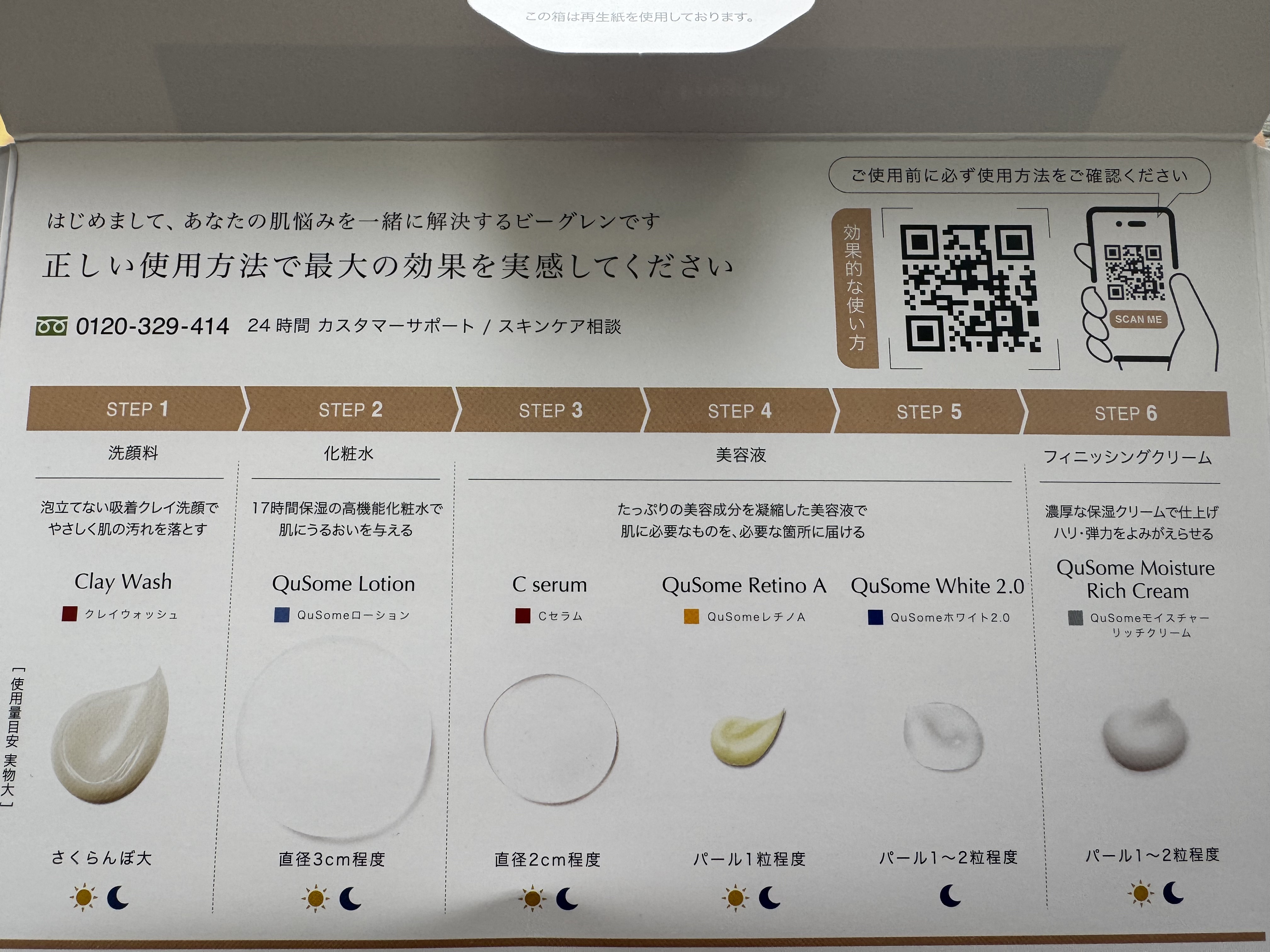 - 紫外線ダメージ*1に負けない透明感のある明るい肌印象へ導く「ホワイトケア*2」。お手入れの鍵を握るのは、美容の専門家によるお手入れ*3を再現した「ビタミンC*4」「レチノール*4」「ハイドロキノン*4」のトリプル処方です。夜は6ステップ、朝は5ステップで一点の曇りも残さない透き通るような素肌を目指します。 *1 乾燥のこと *2 QuSomeホワイト2.0によるケア *3 the salon by b.glen でのお手入れ *4 整肌成分 クレイウォッシュ (25g)/QuSomeローション (12mL)/Cセラム (5mL)/QuSomeレチノA (5g)/QuSomeホワイト2.0 (5g)/QuSomeモイスチャーリッチクリーム (7g)