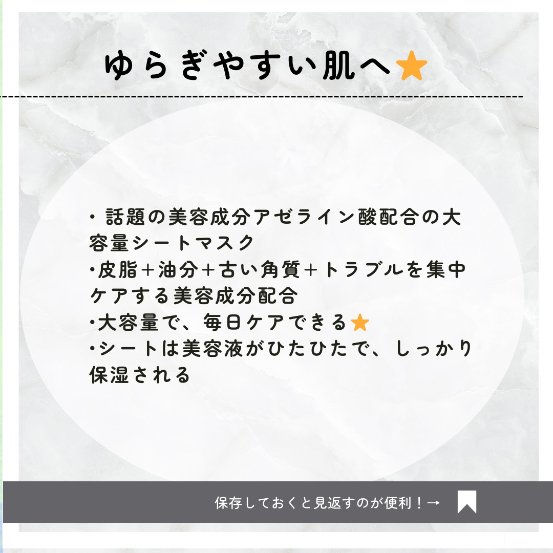 - 古い角質にアプローチするAHA*&BHA*に加え肌荒れを防ぎ、健やかな肌を保つAZELAIC ACID*が配合されたAZケア マスク。330gの大容量で最後の1枚までエッセンスがヒタヒタ!さっぱりした使い心地で毎日肌荒れ予防ケア! *角質ケア成分