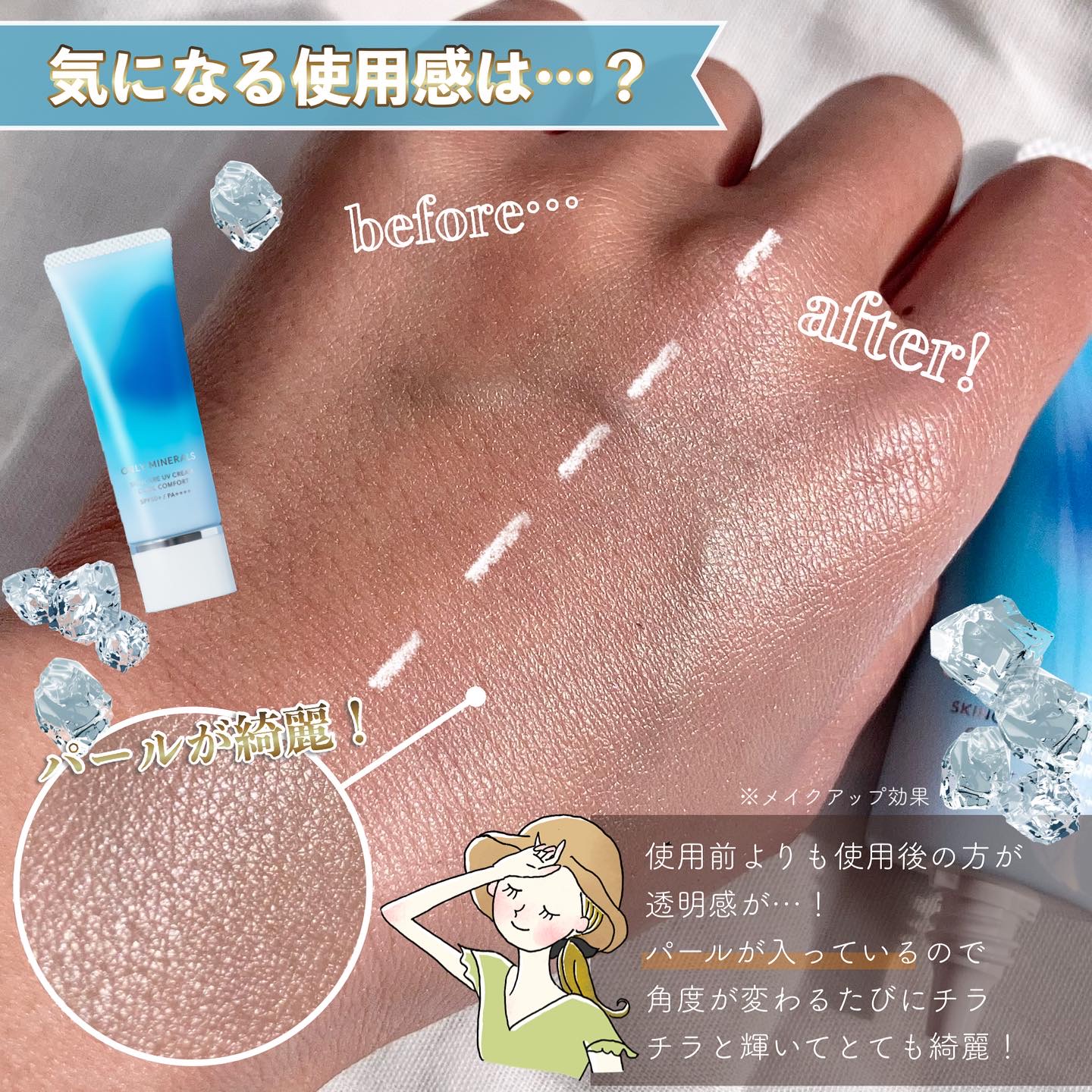 - 〈数量限定〉 汗をかくたび、心地よいひんやり感が楽しめる冷感UV下地。刺激が少ない*²メントール誘導体*³配合、紫外線吸収剤フリーで、パサつきやきしみのないみずみずしいウォーターベースです。贅沢に配合された保湿成分が日中の乾燥から肌を守り、うるおいをキープ。さらに微小なミネラルパールが、光の効果で透明感*⁹あふれる美肌を演出します。 ✔ 敏感肌でも汗をかくたびひんやりクール感 肌刺激の少なさ*²とひんやり感の持続で選んだメントール誘導体*³を配合。肌にのばしたときにひんやり、汗をかくたびに清涼感が得られます。 ✔ 日中の肌をうるおすスキンケア成分配合 紫外線を浴びる肌を考慮して厳選した植物エキスを配合。ビタミンB群の一種であるパンテノール*¹⁰も配合し、夏の肌のすこやかさを守ります。 ✔ UVカット値、耐水性がパワーアップ 紫外線吸収剤フリーのナチュラルな成分でSPF50+・PA++++・UV耐水性★★を実現。落とすときは石けんでさっとオフできます。 ✔ みずみずしいウォーターベース みずみずしくなめらかにのびて、紫外線吸収剤フリーなのにきしみや乾燥感のないテクスチャー。まるでスキンケアの乳液のような心地よさです。 ✔ 爽やかなローズマリー×ティーツリーの香り 肌にのばしたときふわっと漂う、爽やかなローズマリー精油とティーツリー精油の香り。朝のメイク時間に気分をリフレッシュ。 フリー成分:合成着色料(タール系色素)、合成香料、紫外線吸収剤、鉱物油、石油系界面活性剤、パラベン、コムギ由来成分、エタノール、タルク、合成酸化防止剤、動物由来成分 配合成分:ミネラル+天然由来成分89% *² すべての方に刺激が起きないわけではありません。 *³ メントキシプロバンジオール(清涼剤) *⁹ メイクアップ効果 *¹⁰ 保湿成分 ※コスメキッチン・ロフトにて、3月1日(土)より先行発売、3月15日(土)より全国発売