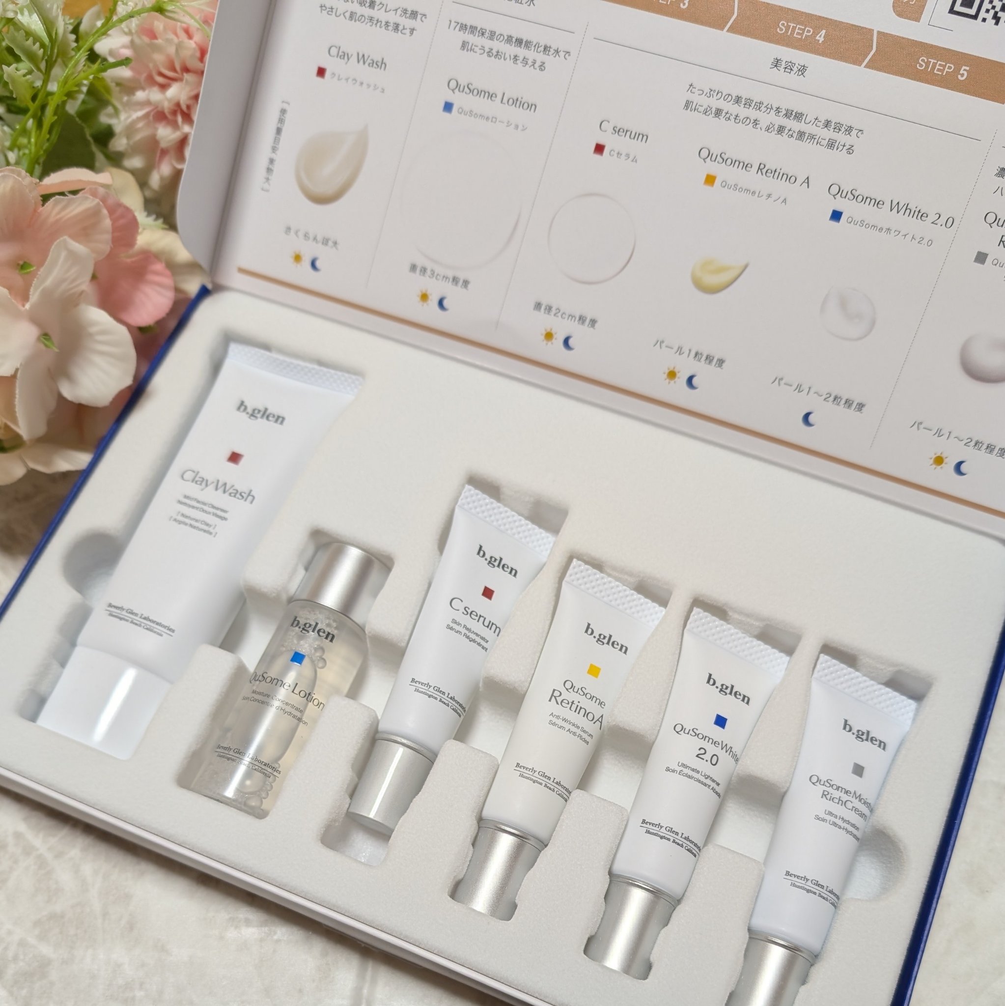 - 紫外線ダメージ*1に負けない透明感のある明るい肌印象へ導く「ホワイトケア*2」。お手入れの鍵を握るのは、美容の専門家によるお手入れ*3を再現した「ビタミンC*4」「レチノール*4」「ハイドロキノン*4」のトリプル処方です。夜は6ステップ、朝は5ステップで一点の曇りも残さない透き通るような素肌を目指します。 *1 乾燥のこと *2 QuSomeホワイト2.0によるケア *3 the salon by b.glen でのお手入れ *4 整肌成分 クレイウォッシュ (25g)/QuSomeローション (12mL)/Cセラム (5mL)/QuSomeレチノA (5g)/QuSomeホワイト2.0 (5g)/QuSomeモイスチャーリッチクリーム (7g)