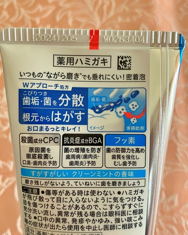 - <クリーンミント 115g><クリーンミント 大容量 170g> 基剤:水、ソルビット液 清掃剤:無水ケイ酸 清浄剤:エリスリトール 湿潤剤:PG、濃グリセリン 粘度調整剤:無水ケイ酸、CMC・Na 発泡剤:ヤシ油脂肪酸アミドプロピルベタイン液、ラウリル硫酸塩 香味剤:香料(クリーンミントタイプ)、サッカリンNa 薬用成分:フッ化ナトリウム(フッ素)、β-グリチルレチン酸(BGA)、塩化セチルピリジニウム(CPC) 着色剤:酸化Ti 粘結剤:キサンタンガム 洗浄剤:ミリストイルグルタミン酸Na pH調整剤:水酸化ナトリウム液 清掃助剤:無水ピロリン酸Na <ストロングミント 115g><ストロングミント 大容量 170g> 基剤:水、ソルビット液 清掃剤:無水ケイ酸 清浄剤:エリスリトール 湿潤剤:PG、濃グリセリン 粘度調整剤:無水ケイ酸、CMC・Na 発泡剤:ヤシ油脂肪酸アミドプロピルベタイン液、ラウリル硫酸塩 香味剤:香料(ストロングミントタイプ)、サッカリンNa 薬用成分:フッ化ナトリウム(フッ素)、β-グリチルレチン酸(BGA)、塩化セチルピリジニウム(CPC) 着色剤:酸化Ti 粘結剤:キサンタンガム 洗浄剤:ミリストイルグルタミン酸Na pH調整剤:水酸化ナトリウム液 清掃助剤:無水ピロリン酸Na <フレッシュカシス 115g><フレッシュカシス 大容量 170g> 基剤:水、ソルビット液 清掃剤:無水ケイ酸 清浄剤:エリスリトール 湿潤剤:PG、濃グリセリン 粘度調整剤:無水ケイ酸、CMC・Na 発泡剤:ヤシ油脂肪酸アミドプロピルベタイン液、ラウリル硫酸塩 香味剤:香料(フレッシュカシスタイプ)、サッカリンNa 薬用成分:フッ化ナトリウム(フッ素)、β-グリチルレチン酸(BGA)、塩化セチルピリジニウム(CPC) 着色剤:酸化Ti 粘結剤:キサンタンガム 洗浄剤:ミリストイルグルタミン酸Na pH調整剤:水酸化ナトリウム液 清掃助剤:無水ピロリン酸Na