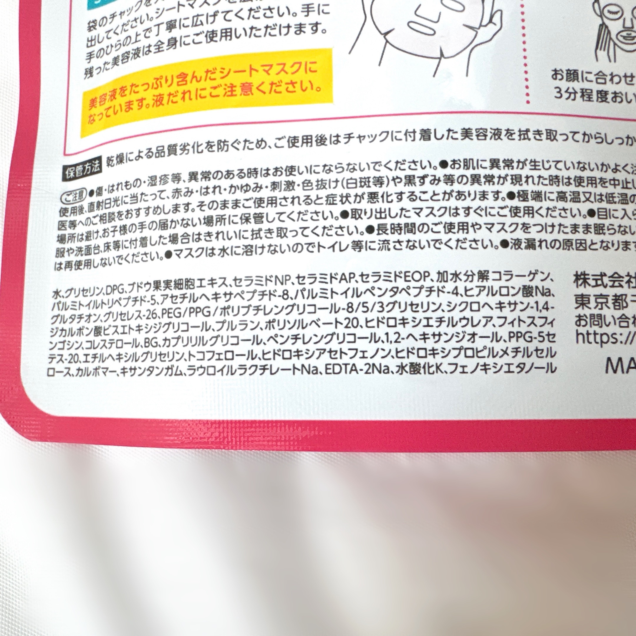 - <7枚入り(130ml)> 水、ペンチレングリコール、BG、グリセリン、ヒアルロン酸Na、キサンタンガム、カルボマー、水酸化K、フェノキシエタノール、トコフェロール、カプリリルグリコール、エチルヘキシルグリセリン、DPG、加水分解コラーゲン、セラミドNP、ラウロイルラクチレートNa、コレステロール、セラミドAP、フィトスフィンゴシン、セラミドEOP、ヒドロキシプロピルメチルセルロース、ポリソルベート20、1,2-ヘキサンジオール、EDTA-2Na、PEG/PPG/ポリブチレングリコール-8/5/3グリセリン、アセチルヘキサペプチド-8、パルミトイルトリペプチド-5、プルラン、シクロヘキサン-1,4-ジカルボン酸ビスエトキシジグリコール、パルミトイルペンタペプチド-4、グリセレス-26、ヒドロキシエチルウレア、ヒドロキシアセトフェノン、グルタチオン、ブドウ果実細胞エキス、PPG-5セテス-20