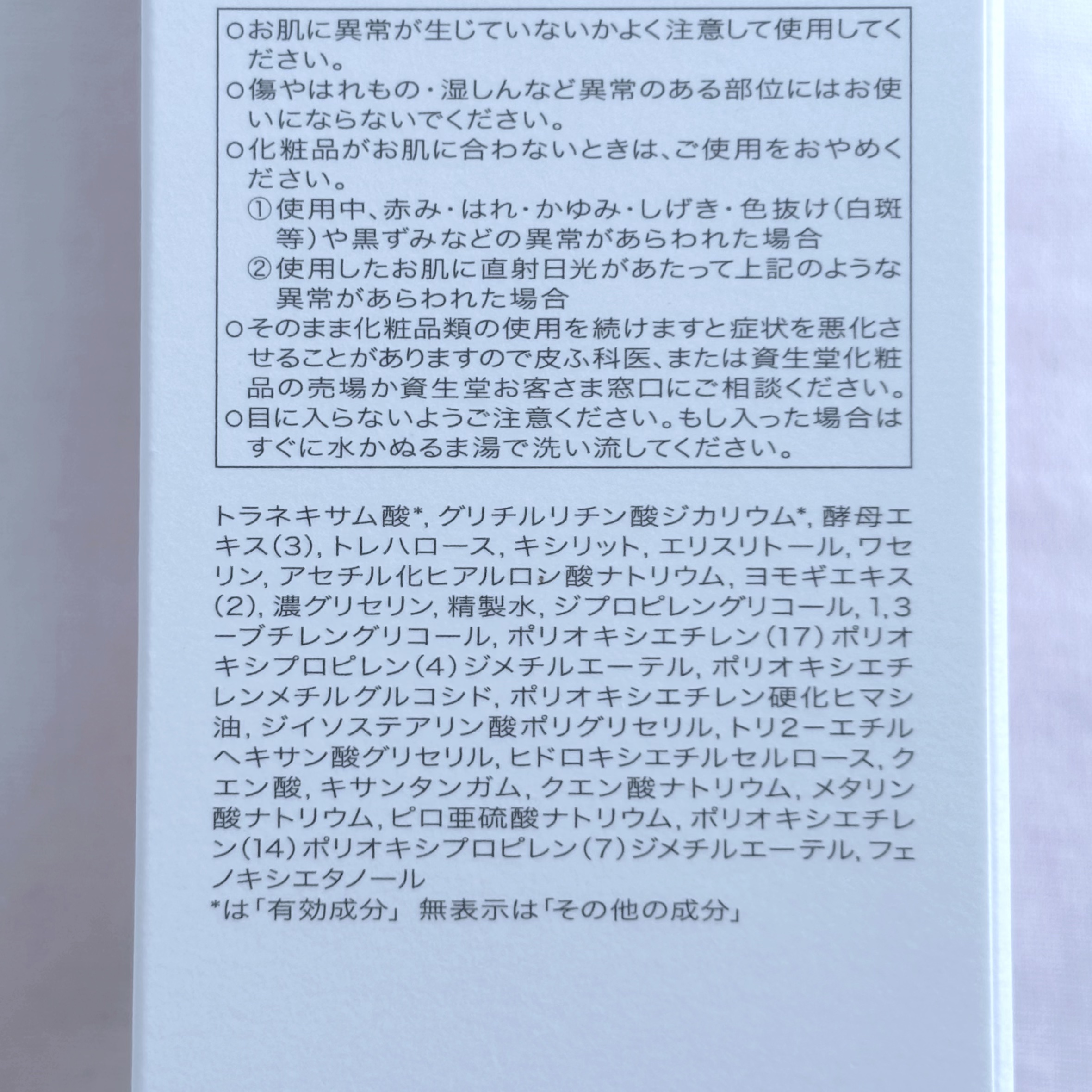 - <本体> 有効成分 トラネキサム酸、グリチルリチン酸ジカリウム その他の成分 酵母エキス(3)、トレハロース、キシリット、エリスリトール、ワセリン、アセチル化ヒアルロン酸ナトリウム、ヨモギエキス(2)、濃グリセリン、精製水、ジプロピレングリコール、1,3-ブチレングリコール、ポリオキシエチレン(17)ポリオキシプロピレン(4)ジメチルエーテル、ポリオキシエチレンメチルグルコシド、ポリオキシエチレン硬化ヒマシ油、ジイソステアリン酸ポリグリセリル、トリ2-エチルヘキサン酸グリセリル、ヒドロキシエチルセルロース、クエン酸、キサンタンガム、クエン酸ナトリウム、メタリン酸ナトリウム、ピロ亜硫酸ナトリウム、ポリオキシエチレン(14)ポリオキシプロピレン(7)ジメチルエーテル、フェノキシエタノール <125mL(レフィル)> 有効成分 トラネキサム酸、グリチルリチン酸ジカリウム その他の成分 酵母エキス(3)、トレハロース、キシリット、エリスリトール、ワセリン、アセチル化ヒアルロン酸ナトリウム、ヨモギエキス(2)、濃グリセリン、精製水、ジプロピレングリコール、1,3-ブチレングリコール、ポリオキシエチレン(17)ポリオキシプロピレン(4)ジメチルエーテル、ポリオキシエチレンメチルグルコシド、ポリオキシエチレン硬化ヒマシ油、ジイソステアリン酸ポリグリセリル、トリ2-エチルヘキサン酸グリセリル、ヒドロキシエチルセルロース、クエン酸、キサンタンガム、クエン酸ナトリウム、メタリン酸ナトリウム、ピロ亜硫酸ナトリウム、ポリオキシエチレン(14)ポリオキシプロピレン(7)ジメチルエーテル、フェノキシエタノール <120mL(レフィル)> 有効成分 トラネキサム酸、グリチルリチン酸ジカリウム その他の成分 酵母エキス(3)、トレハロース、キシリット、エリスリトール、ワセリン、アセチル化ヒアルロン酸ナトリウム、ヨモギエキス(2)、濃グリセリン、精製水、ジプロピレングリコール、1,3-ブチレングリコール、ポリオキシエチレン(17)ポリオキシプロピレン(4)ジメチルエーテル、ポリオキシエチレンメチルグルコシド、ポリオキシエチレン硬化ヒマシ油、ジイソステアリン酸ポリグリセリル、トリ2-エチルヘキサン酸グリセリル、ヒドロキシエチルセルロース、クエン酸、キサンタンガム、クエン酸ナトリウム、メタリン酸ナトリウム、ピロ亜硫酸ナトリウム、ポリオキシエチレン(14)ポリオキシプロピレン(7)ジメチルエーテル、フェノキシエタノール