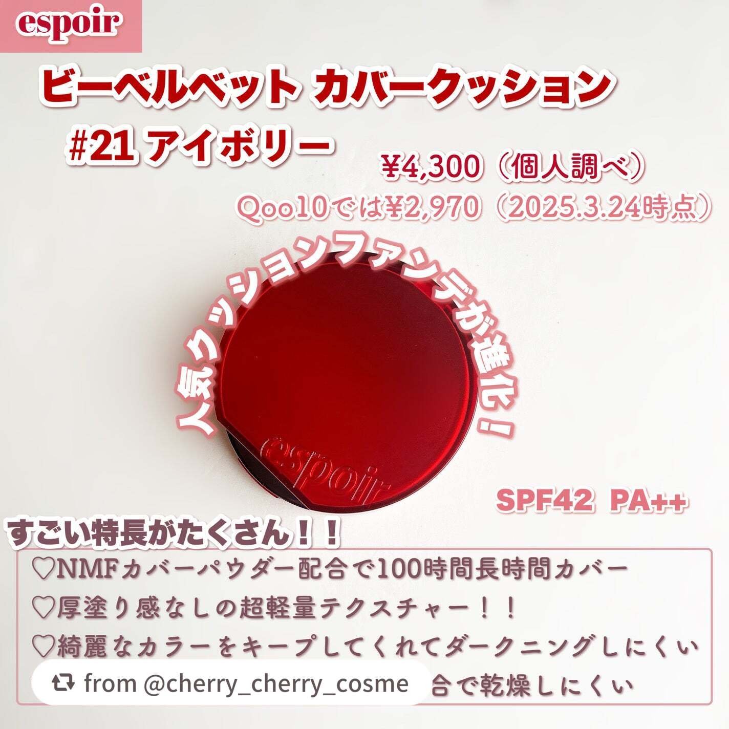 クッション選びのポイントはなんですか🤔?今回は、クッションマッチプのespoir💕クッションファンデを徹底比較します!୨୧ビーベルベットカバークッション真っ赤が目を引くこのクッション👀❤️🔥ベルベットマットなやわからいのにマットの不思議なテ...