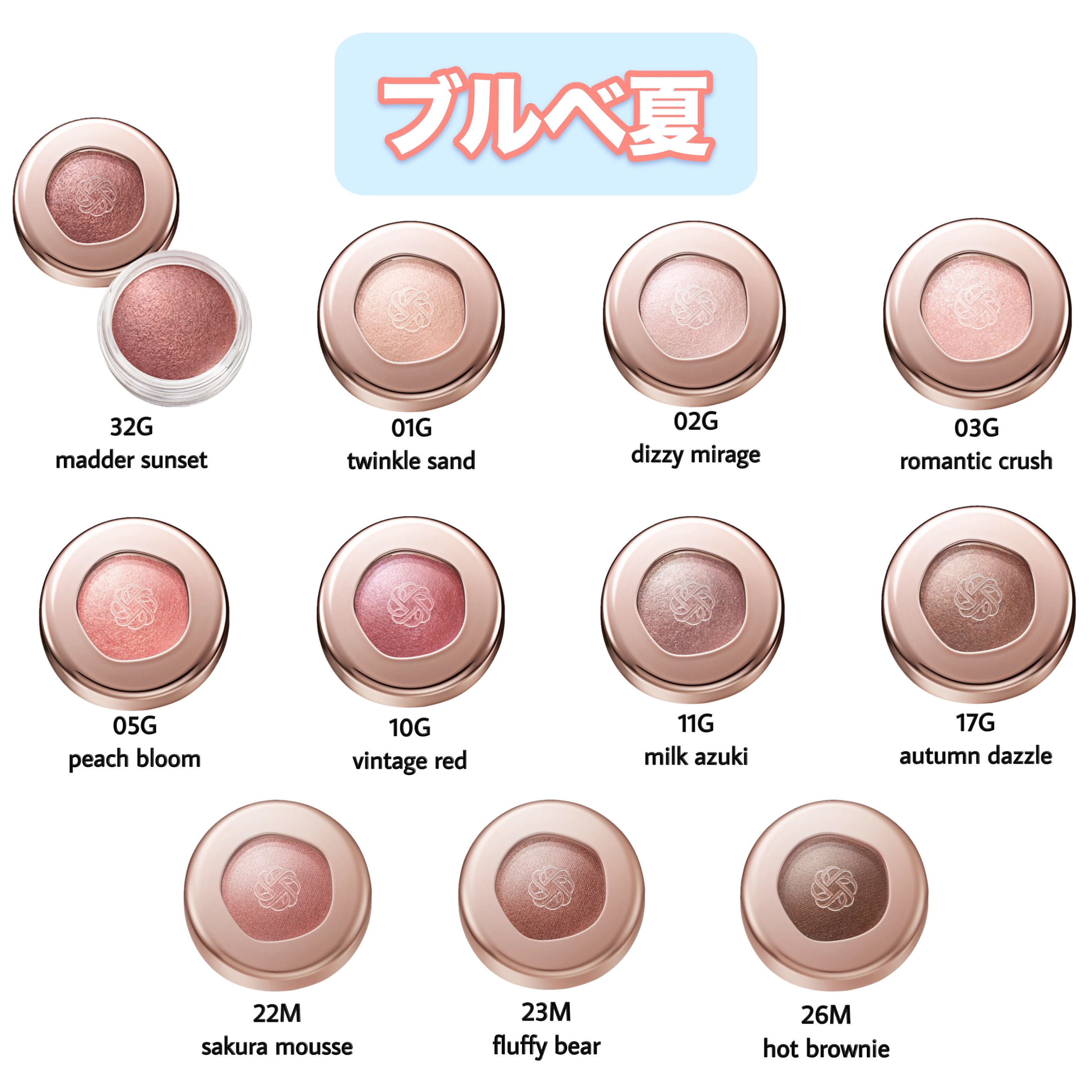 - <01G twinkle sand> シクロメチコン、合成フルオロフロゴパイト、ジフェニルジメチコン、(ジメチコン/ビニルジメチコン)クロスポリマー、イソドデカン、トリメチルシロキシケイ酸、ジメチコン、アストロカリウムムルムル種子脂、ゼニアオイエキス、ダマスクバラ花エキス、トコフェロール、マツリカ花エキス、レモン果実エキス、BG、BHT、TEA、(HDI/トリメチロールヘキシルラクトン)クロスポリマー、イソステアリン酸デキストリン、エタノール、エチルヘキサン酸セチル、キサンタンガム、シリカ、ジメチルシリル化シリカ、スクワラン、ステアリン酸イヌリン、セルロース、テトラ(ジ-t-ブチルヒドロキシヒドロケイヒ酸)ペンタエリスリチル、トリ(カプリル酸/カプリン酸)グリセリル、トリイソステアリン酸イソプロピルチタン、トリエチルヘキサノイン、ハイドロゲンジメチコン、ポリプロピレン、ミネラルオイル、合成ワックス、酸化スズ、水、水酸化Al、水添ポリ(C6-20オレフィン)、水添レシチン、麻セルロース、フェノキシエタノール、香料、オキシ塩化ビスマス、グンジョウ、マイカ、酸化チタン、酸化鉄 <02G dizzy mirage> 合成フルオロフロゴパイト、シクロメチコン、ジフェニルジメチコン、(ジメチコン/ビニルジメチコン)クロスポリマー、イソドデカン、トリメチルシロキシケイ酸、ジメチコン、アストロカリウムムルムル種子脂、ゼニアオイエキス、ダマスクバラ花エキス、トコフェロール、マツリカ花エキス、レモン果実エキス、BG、BHT、TEA、(HDI/トリメチロールヘキシルラクトン)クロスポリマー、イソステアリン酸デキストリン、エタノール、エチルヘキサン酸セチル、キサンタンガム、シリカ、ジメチルシリル化シリカ、スクワラン、ステアリン酸イヌリン、セルロース、テトラ(ジ-t-ブチルヒドロキシヒドロケイヒ酸)ペンタエリスリチル、トリ(カプリル酸/カプリン酸)グリセリル、トリイソステアリン酸イソプロピルチタン、トリエチルヘキサノイン、ハイドロゲンジメチコン、ポリプロピレン、ミネラルオイル、合成ワックス、酸化スズ、水、水酸化Al、水添ポリ(C6-20オレフィン)、水添レシチン、麻セルロース、フェノキシエタノール、香料、オキシ塩化ビスマス、グンジョウ、マイカ、酸化チタン、酸化鉄 <03G romantic crush> 合成フルオロフロゴパイト、シクロメチコン、ジフェニルジメチコン、(ジメチコン/ビニルジメチコン)クロスポリマー、イソドデカン、トリメチルシロキシケイ酸、ジメチコン、ホウケイ酸(Ca/Al)、アストロカリウムムルムル種子脂、ゼニアオイエキス、ダマスクバラ花エキス、トコフェロール、マツリカ花エキス、レモン果実エキス、BG、BHT、TEA、(HDI/トリメチロールヘキシルラクトン)クロスポリマー、イソステアリン酸デキストリン、エタノール、エチルヘキサン酸セチル、キサンタンガム、シリカ、ジメチルシリル化シリカ、スクワラン、ステアリン酸イヌリン、セルロース、テトラ(ジ-t-ブチルヒドロキシヒドロケイヒ酸)ペンタエリスリチル、トリ(カプリル酸/カプリン酸)グリセリル、トリイソステアリン酸イソプロピルチタン、トリエチルヘキサノイン、トリエトキシカプリリルシラン、ハイドロゲンジメチコン、ポリプロピレン、ミネラルオイル、合成ワックス、酸化スズ、水、水酸化Al、水添ポリ(C6-20オレフィン)、水添レシチン、麻セルロース、フェノキシエタノール、香料、オキシ塩化ビスマス、グンジョウ、マイカ、酸化チタン、酸化鉄 <04G gold glint> 合成フルオロフロゴパイト、シクロメチコン、ジフェニルジメチコン、(ジメチコン/ビニルジメチコン)クロスポリマー、イソドデカン、トリメチルシロキシケイ酸、ジメチコン、ホウケイ酸(Ca/Al)、アストロカリウムムルムル種子脂、ゼニアオイエキス、ダマスクバラ花エキス、トコフェロール、マツリカ花エキス、レモン果実エキス、BG、BHT、TEA、(HDI/トリメチロールヘキシルラクトン)クロスポリマー、イソステアリン酸デキストリン、エタノール、エチルヘキサン酸セチル、キサンタンガム、シリカ、ジメチルシリル化シリカ、スクワラン、ステアリン酸イヌリン、セルロース、テトラ(ジ-t-ブチルヒドロキシヒドロケイヒ酸)ペンタエリスリチル、トリ(カプリル酸/カプリン酸)グリセリル、トリイソステアリン酸イソプロピルチタン、トリエチルヘキサノイン、ハイドロゲンジメチコン、ポリプロピレン、ミネラルオイル、ラウリン酸亜鉛、合成ワックス、酸化スズ、水、水酸化Al、水添ポリ(C6-20オレフィン)、水添レシチン、麻セルロース、フェノキシエタノール、香料、オキシ塩化ビスマス、グンジョウ、マイカ、酸化チタン、酸化鉄 <05G peach bloom> シクロメチコン、合成フルオロフロゴパイト、ジフェニルジメチコン、(ジメチコン/ビニルジメチコン)クロスポリマー、イソドデカン、トリメチルシロキシケイ酸、ジメチコン、アストロカリウムムルムル種子脂、ゼニアオイエキス、ダマスクバラ花エキス、トコフェロール、マ