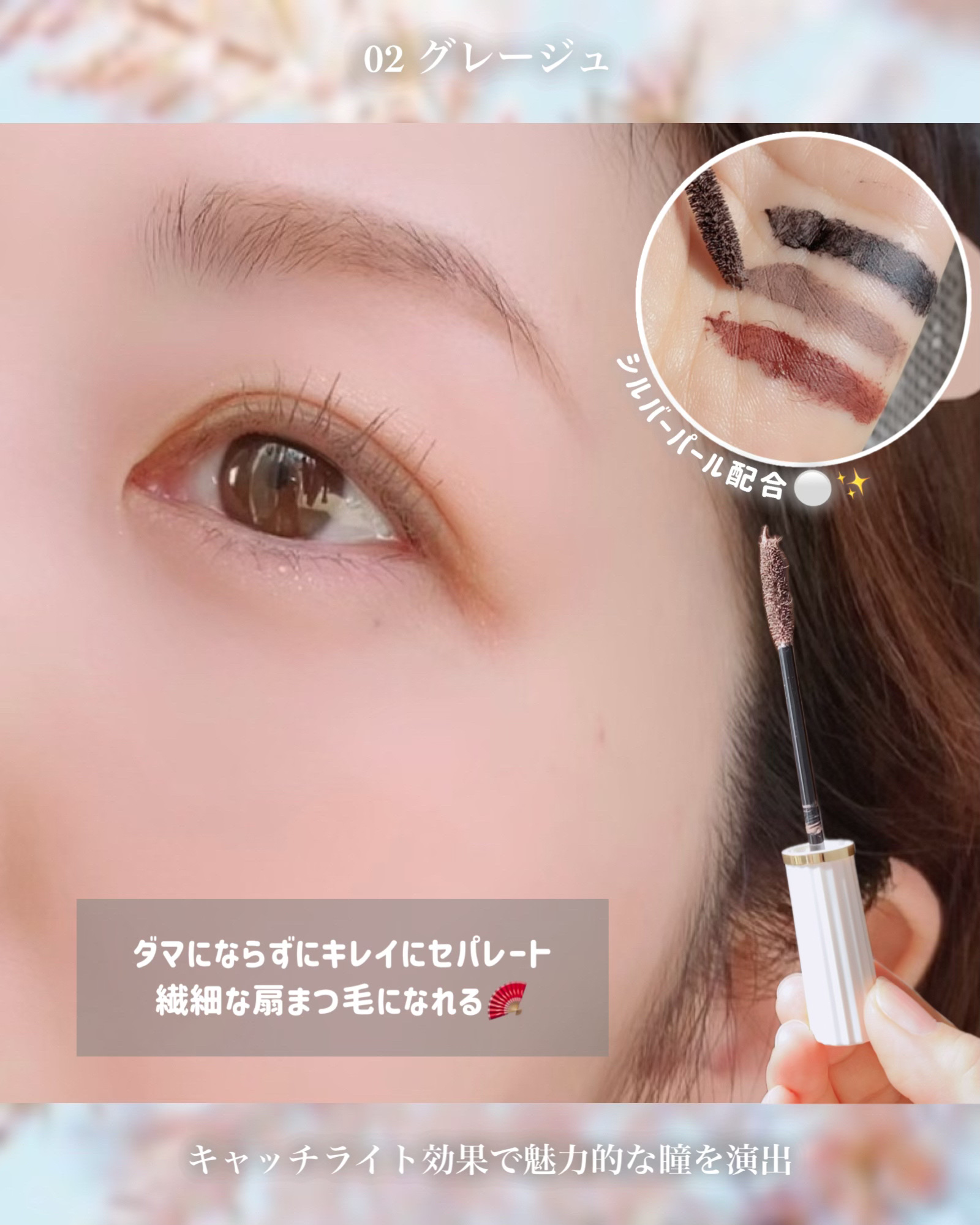 - ロング・カール・セパレート。全方位どこから見ても美しいまつ毛に仕上げ、キラキラ輝く瞳を演出 •すらりと先端まで美しくのびるロング効果×根元から立ち上がる上向きカール×繊細セパレートで、まるで自まつ毛が伸びたかのように自然で全方位どこから見ても美しい、印象的なまつ毛にスタイリング! さらにキャッチライト効果により、光をとりこんでキラキラと輝く、いきいきと魅力的な瞳を演出して目もと印象を美しく高めます。 •美しく重ね塗りの出来るベストなタイミングで乾くように設計したベースで、重ね塗りも思いのまま。するするとのび広がり、思い通りのまつ毛に仕上げます。汗、水に強いウォータープルーフ処方で、美しい仕上がりをキープします。 •毛の密度が高く、目のキワまで入りやすいブラシを採用したことでまつ毛1本1本を根元からしっかりととかすことができ、繊細に仕上げます。 予約受付開始:3月18日(火)