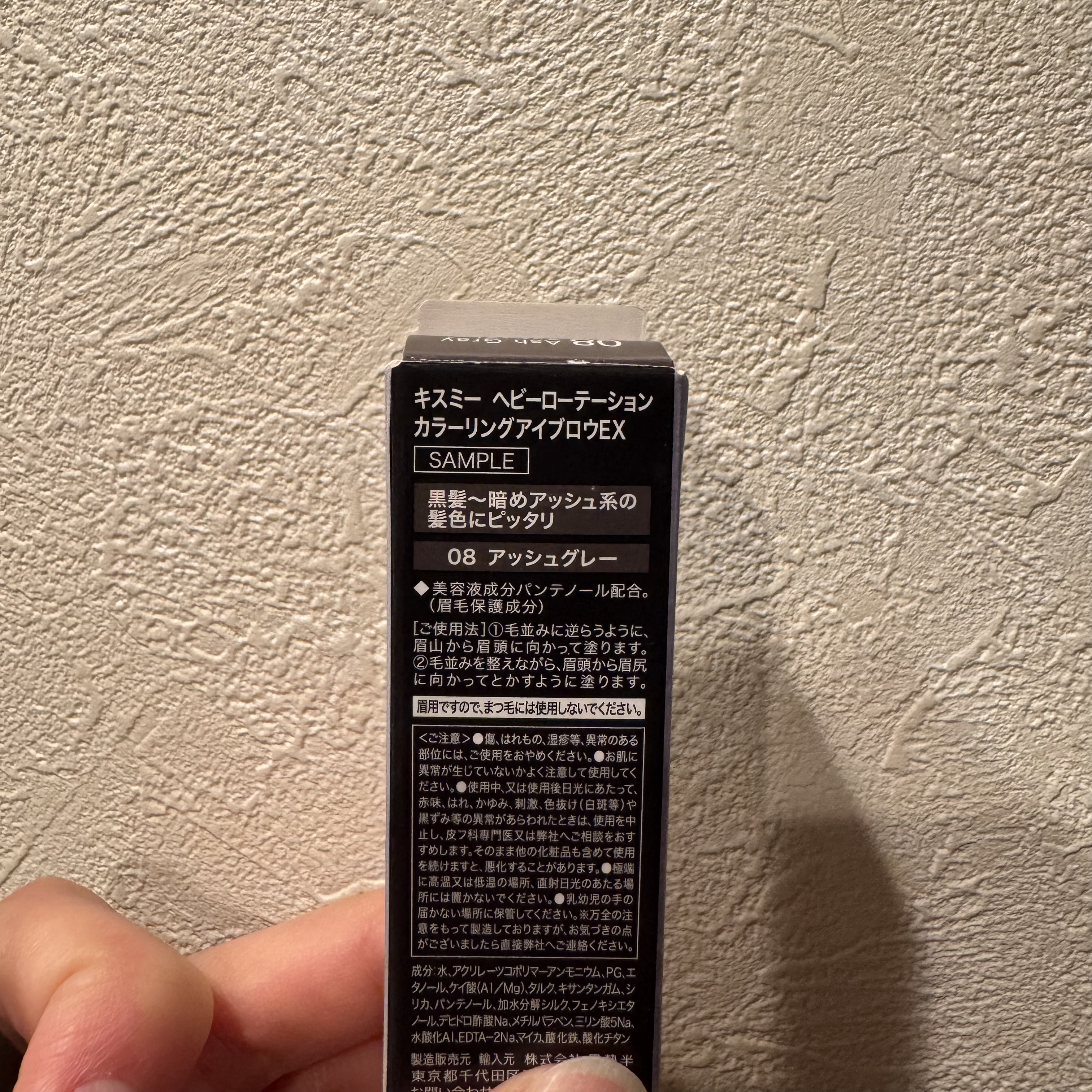 - <01 イエローブラウン> 水、アクリレーツコポリマーアンモニウム、PG、エタノール、ケイ酸(Al/Mg)、タルク、キサンタンガム、シリカ、パンテノール、加水分解シルク、フェノキシエタノール、デヒドロ酢酸Na、メチルパラベン、三リン酸5Na、EDTA-2Na、酸化鉄、マイカ、酸化チタン <03 アッシュブラウン> 水、アクリレーツコポリマーアンモニウム、PG、エタノール、ケイ酸(Al/Mg)、タルク、キサンタンガム、シリカ、パンテノール、加水分解シルク、フェノキシエタノール、デヒドロ酢酸Na、メチルパラベン、水酸化Al、三リン酸5Na、EDTA-2Na、酸化鉄、酸化チタン、マイカ <04 ナチュラルブラウン> 水、アクリレーツコポリマーアンモニウム、PG、エタノール、ケイ酸(Al/Mg)、タルク、キサンタンガム、シリカ、パンテノール、加水分解シルク、フェノキシエタノール、デヒドロ酢酸Na、メチルパラベン、三リン酸5Na、EDTA-2Na、酸化鉄、マイカ、酸化チタン <05 ライトブラウン> 水、アクリレーツコポリマーアンモニウム、PG、エタノール、ケイ酸(Al/Mg)、タルク、キサンタンガム、シリカ、パンテノール、加水分解シルク、フェノキシエタノール、デヒドロ酢酸Na、メチルパラベン、三リン酸5Na、EDTA-2Na、酸化鉄、マイカ、酸化チタン、グンジョウ <08 アッシュグレー> 水、アクリレーツコポリマーアンモニウム、PG、エタノール、ケイ酸(Al/Mg)、タルク、キサンタンガム、シリカ、パンテノール、加水分解シルク、フェノキシエタノール、デヒドロ酢酸Na、メチルパラベン、三リン酸5Na、水酸化Al、EDTA-2Na、マイカ、酸化鉄、酸化チタン <09 ナチュラルアッシュ> 水、アクリレーツコポリマーアンモニウム、PG、エタノール、ケイ酸(Al/Mg)、タルク、キサンタンガム、シリカ、パンテノール、加水分解シルク、フェノキシエタノール、デヒドロ酢酸Na、メチルパラベン、三リン酸5Na、水酸化Al、EDTA-2Na、マイカ、酸化鉄、酸化チタン <12 グレイッシュベージュ> 水、アクリレーツコポリマーアンモニウム、PG、エタノール、ケイ酸(Al/Mg)、タルク、キサンタンガム、シリカ、パンテノール、加水分解シルク、フェノキシエタノール、デヒドロ酢酸Na、メチルパラベン、水酸化Al、三リン酸5Na、EDTA-2Na、酸化チタン、酸化鉄、マイカ <13 マイルドブラウン> 水、アクリレーツコポリマーアンモニウム、PG、エタノール、ケイ酸(Al/Mg)、タルク、キサンタンガム、シリカ、パンテノール、加水分解シルク、フェノキシエタノール、デヒドロ酢酸Na、メチルパラベン、三リン酸5Na、水酸化Al、EDTA-2Na、酸化鉄、マイカ、酸化チタン <14 シフォンベージュ> 水、アクリレーツコポリマーアンモニウム、PG、エタノール、ケイ酸(Al/Mg)、タルク、キサンタンガム、シリカ、パンテノール、加水分解シルク、フェノキシエタノール、デヒドロ酢酸Na、メチルパラベン、水酸化Al、三リン酸5Na、EDTA-2Na、酸化チタン、酸化鉄、マイカ <15 ダスキーローズ> 水、アクリレーツコポリマーアンモニウム、PG、エタノール、ケイ酸(Al/Mg)、タルク、キサンタンガム、シリカ、パンテノール、加水分解シルク、フェノキシエタノール、デヒドロ酢酸Na、メチルパラベン、三リン酸5Na、水酸化Al、EDTA-2Na、マイカ、酸化チタン、酸化鉄