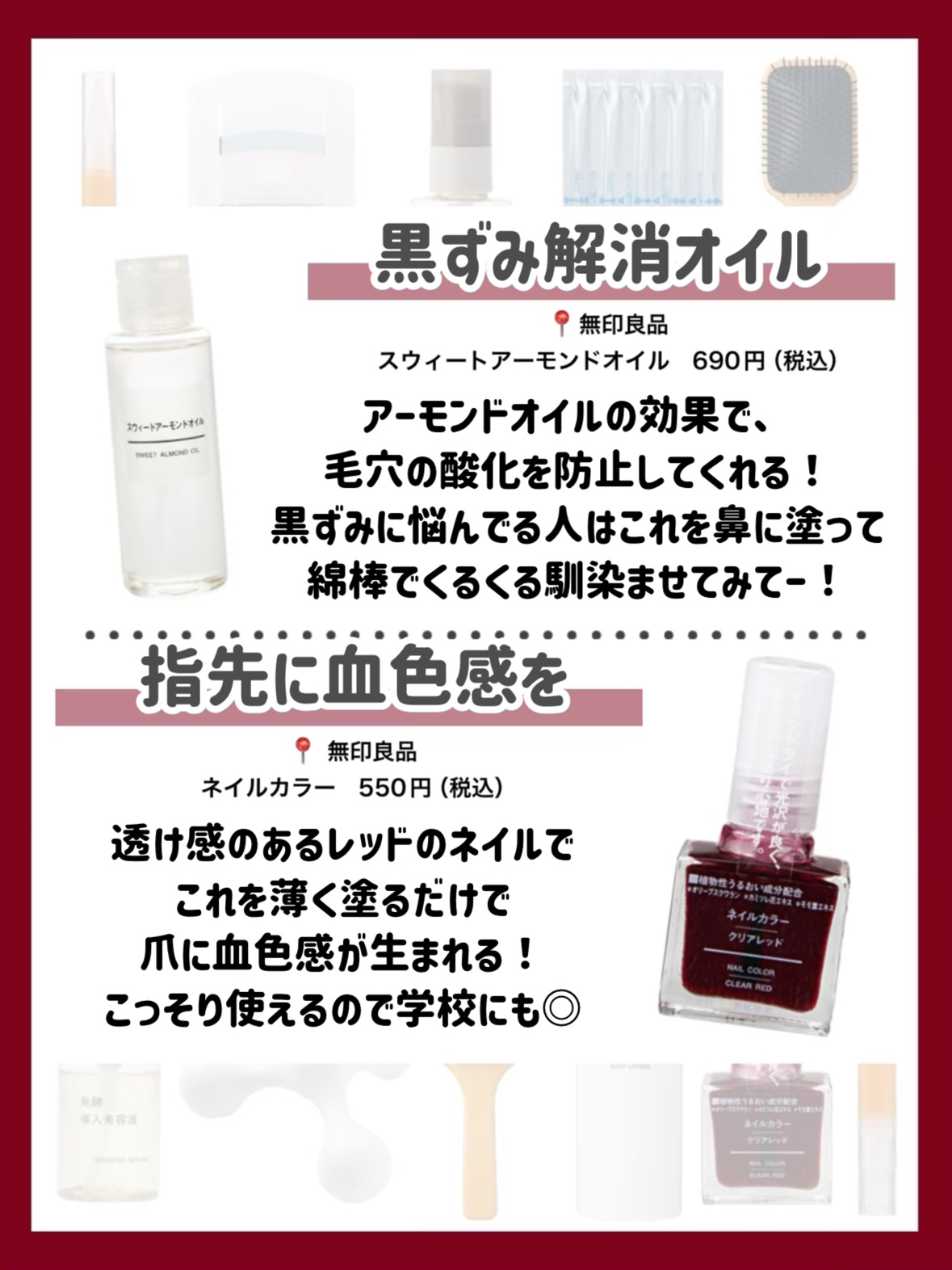 無印週間にもおすすめな厳選5選💅🏻 【無印良品】 ・ネイルケアオイル ¥890 ・甘皮ケアオイル ¥890 ・敏感肌用ハンドクリーム ¥390 ・ネイルカラー ¥590 〚グレージュ〛 ・除光液 ¥490 どれもリピ&愛用品です🥹🤍 無印週間のお買い物のご参考になれば🤲🏻
