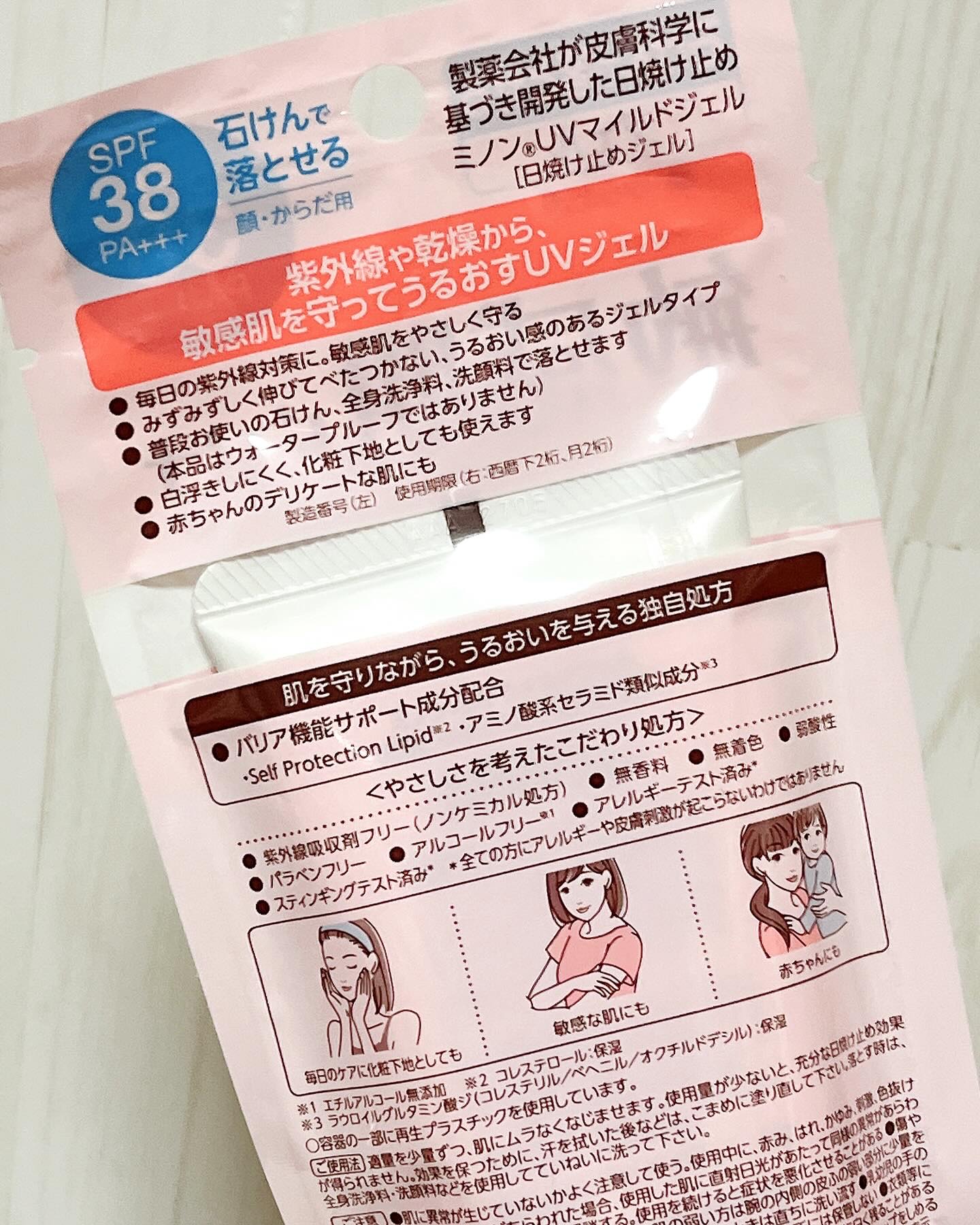 - SPF38 PA+++ 紫外線から敏感肌を守ってうるおすジェルタイプの日焼け止め。みずみずしくのびてべたつかない。顔にもからだにも使えます。白浮きしにくいため、化粧下地にも。いつもお使いの石けん、全身洗浄料、洗顔料で落とせます。家族みんなのUV対策に。 【肌を守りながら、うるおいを与える独自処方】 バリア機能サポート成分(保湿)配合(Self Protection Lipid※1・アミノ酸系セラミド類似成分※2) 【肌へのやさしさを考えたこだわり処方】 紫外線吸吸収剤フリー、パラベンフリー、アルコールフリー※3、無香料・無着色、弱酸性、アレルギーテスト済み、スティンギングテスト済み。(全ての方にアレルギーや皮膚刺激が起こらないわけではありません) ※1 コレステロール:保湿 ※2 ラウロイルグルタミン酸ジ(コレステリル/ベヘニル/オクチルドデシル):保湿 ※3 エチルアルコール無添加