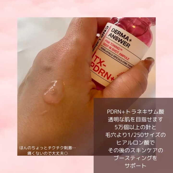 PDRNはポリデオキシリボヌクレオチドというサケの生殖細胞から抽出された低分子量のDNA断片🐟 コラーゲンをサポートしてくれる効果があり特に韓国で最近とっても熱い成分です❤️🔥 ヒアルロン酸を針状にしたヒアルロンスピキュール配合🪡 手で押さえると少しだけチクっと感じますが、個人差もあると思うけど、私は普通に生活していて気にならないくらい! 低刺激処方&毛穴より4,000倍小さい分子なので肌への吸収率が良いのが特徴🥰 お肌がゆらぎやすい方や、敏感肌の方にもおすすめ❣️