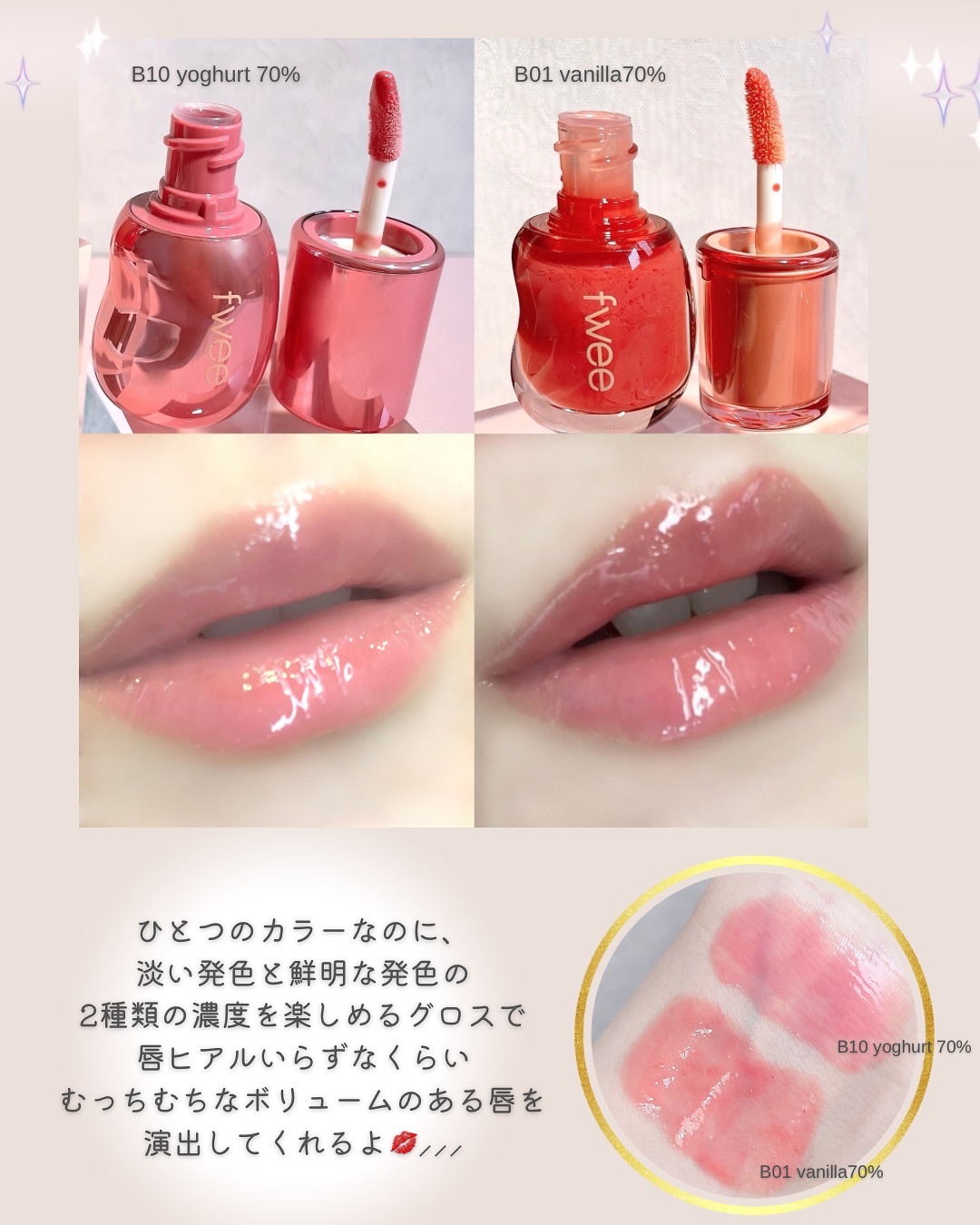 🫧fwee3DVolumingGlossVanilla70%Sorbet70%Aengdu70%Scotch30%いつのまにかこんなに持ってた…70%は単色でも十分なくらいの発色。上からVanilla70%、Sorbet70%、Aengdu7...