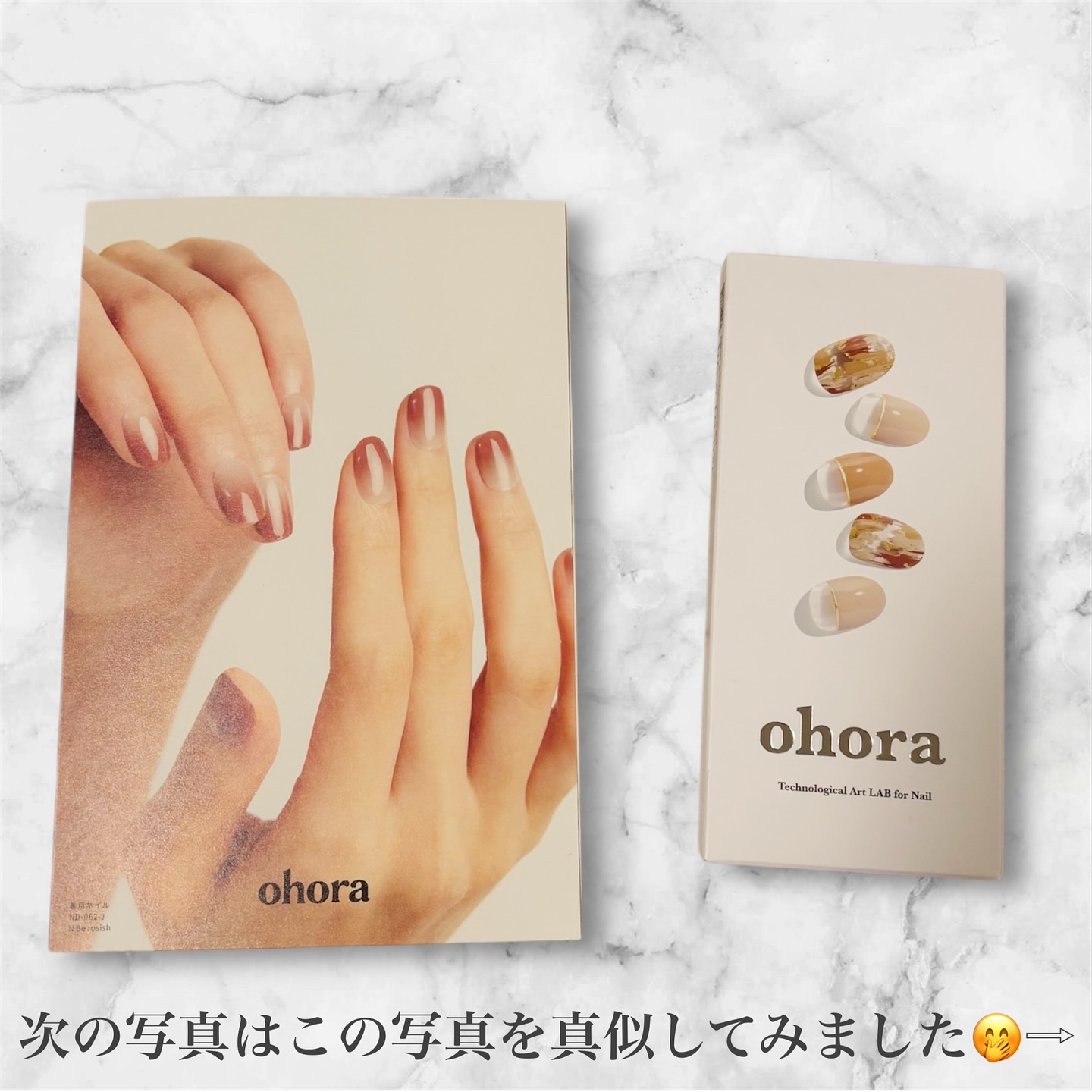 ■ohoraネイルシール*NOmbrerBeigeサロン級仕上がりのネイルが一人でも自宅で気軽に、簡単にできる💅🏻ネイルシールを貼って、爪のサイズに合わせてカット✨ジェルランプで固めるだけで完成なので、とても簡単でした!basicとpoint...
