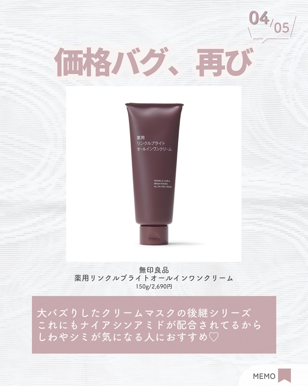\本気を感じる無印良品のエイジングケア/【無印良品】薬用リンクルブライトオールインワンクリームオールインワンなので、忙しい日でもこれ一本でスキンケアが済ませられることが嬉しいアイテム😚🩷保湿を感じるしっとりさがありますが、ベタつかず、塗ってか...