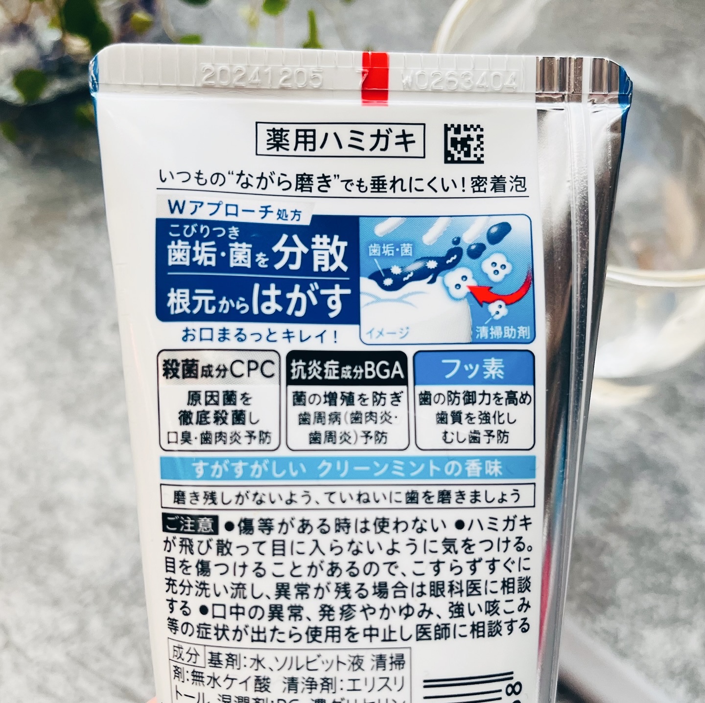 - <クリーンミント 115g><クリーンミント 大容量 170g> 基剤:水、ソルビット液 清掃剤:無水ケイ酸 清浄剤:エリスリトール 湿潤剤:PG、濃グリセリン 粘度調整剤:無水ケイ酸、CMC・Na 発泡剤:ヤシ油脂肪酸アミドプロピルベタイン液、ラウリル硫酸塩 香味剤:香料(クリーンミントタイプ)、サッカリンNa 薬用成分:フッ化ナトリウム(フッ素)、β-グリチルレチン酸(BGA)、塩化セチルピリジニウム(CPC) 着色剤:酸化Ti 粘結剤:キサンタンガム 洗浄剤:ミリストイルグルタミン酸Na pH調整剤:水酸化ナトリウム液 清掃助剤:無水ピロリン酸Na <ストロングミント 115g><ストロングミント 大容量 170g> 基剤:水、ソルビット液 清掃剤:無水ケイ酸 清浄剤:エリスリトール 湿潤剤:PG、濃グリセリン 粘度調整剤:無水ケイ酸、CMC・Na 発泡剤:ヤシ油脂肪酸アミドプロピルベタイン液、ラウリル硫酸塩 香味剤:香料(ストロングミントタイプ)、サッカリンNa 薬用成分:フッ化ナトリウム(フッ素)、β-グリチルレチン酸(BGA)、塩化セチルピリジニウム(CPC) 着色剤:酸化Ti 粘結剤:キサンタンガム 洗浄剤:ミリストイルグルタミン酸Na pH調整剤:水酸化ナトリウム液 清掃助剤:無水ピロリン酸Na <フレッシュカシス 115g><フレッシュカシス 大容量 170g> 基剤:水、ソルビット液 清掃剤:無水ケイ酸 清浄剤:エリスリトール 湿潤剤:PG、濃グリセリン 粘度調整剤:無水ケイ酸、CMC・Na 発泡剤:ヤシ油脂肪酸アミドプロピルベタイン液、ラウリル硫酸塩 香味剤:香料(フレッシュカシスタイプ)、サッカリンNa 薬用成分:フッ化ナトリウム(フッ素)、β-グリチルレチン酸(BGA)、塩化セチルピリジニウム(CPC) 着色剤:酸化Ti 粘結剤:キサンタンガム 洗浄剤:ミリストイルグルタミン酸Na pH調整剤:水酸化ナトリウム液 清掃助剤:無水ピロリン酸Na