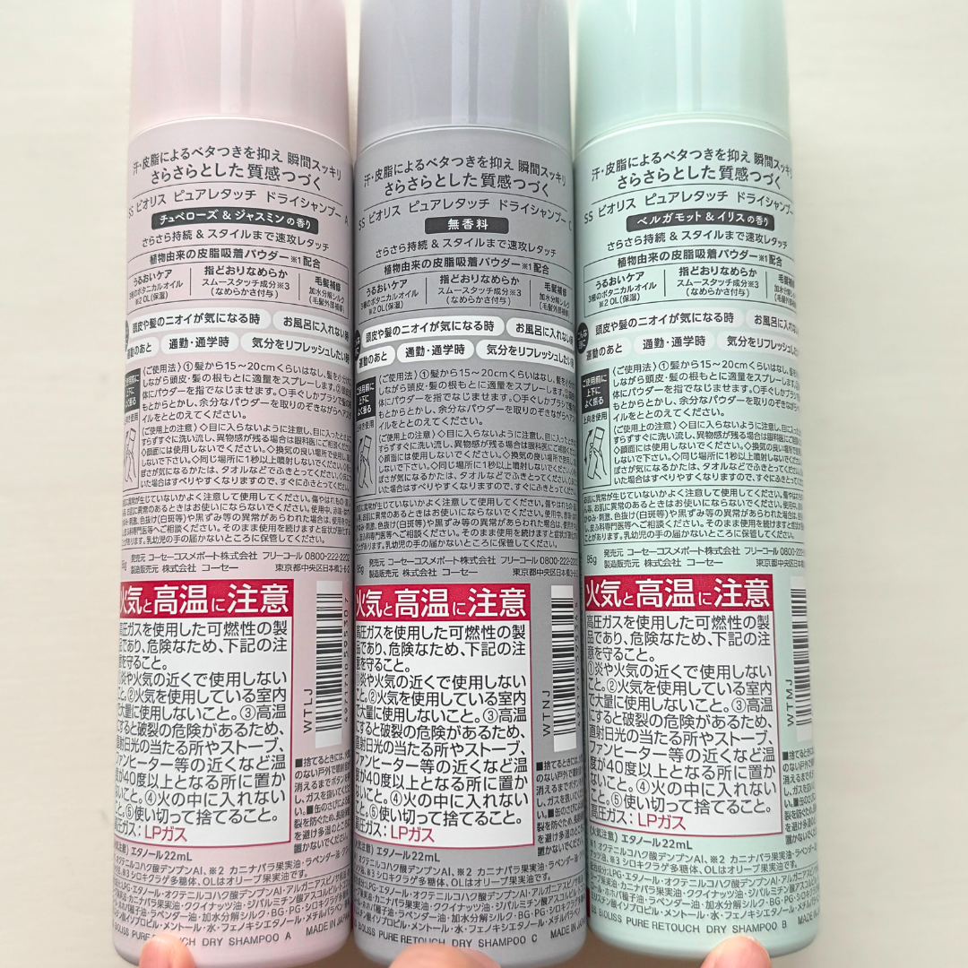 \瞬間サラサラ!スタイル復活/▶︎ビオリスピュアレタッチドライシャンプー汗や皮脂によるベタつきを抑えてさらさらとした質感が続くドライシャンプー。植物由来の皮脂吸着パウダー*1が配合されている上に、うるおいケア、指どおりなめらかに、毛髪補修まで...
