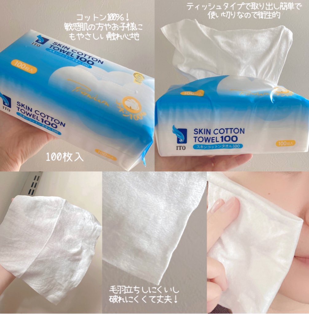 これで顔拭こうITOスキンコットンタオル100 コットン100% 100枚入税込657円洗顔後のふき取りやメイク落としのふき取りパッティング、コットンパック汗ふきなどに使えるペーパータオルコットン100%だから敏感肌の方やお子様にもやさしい触...
