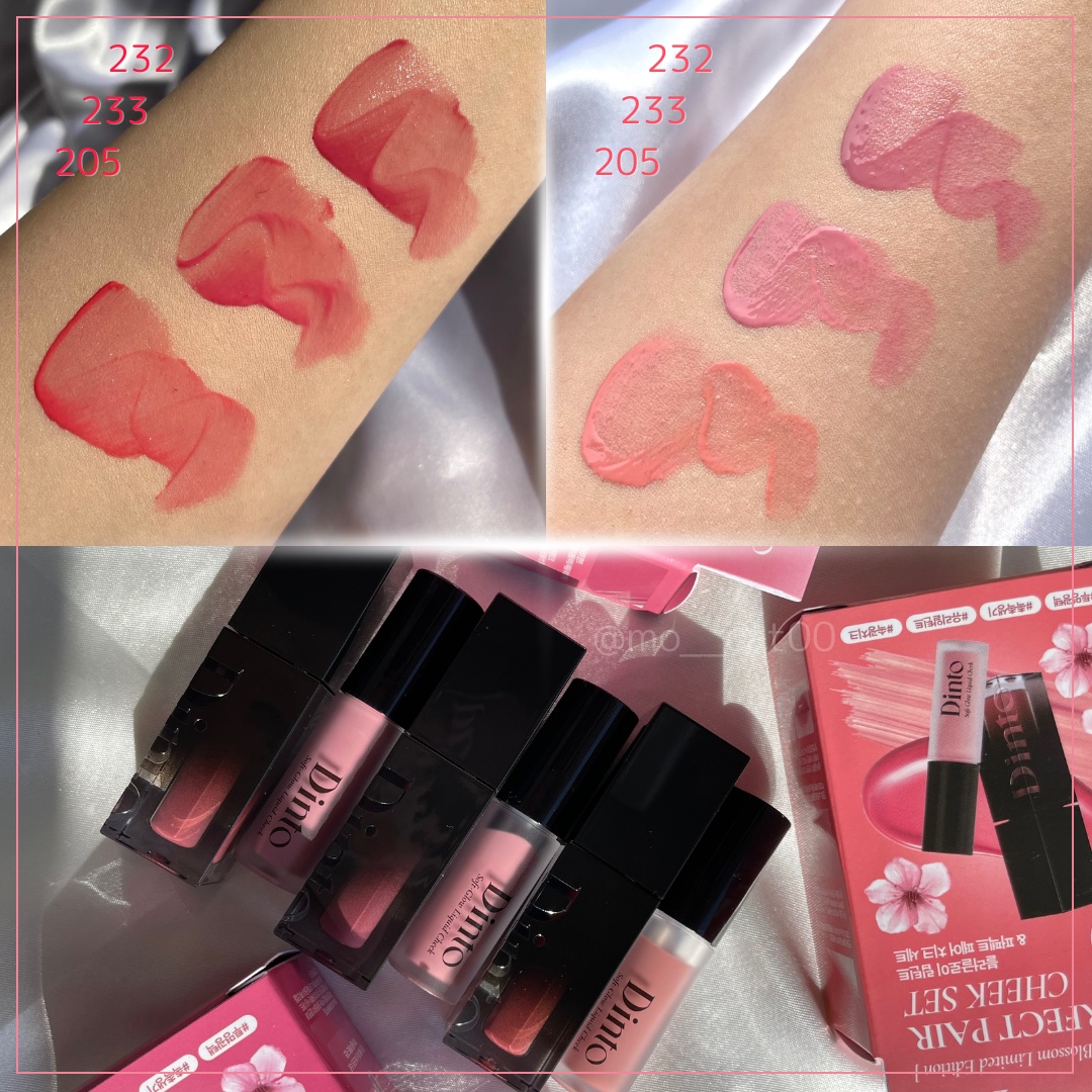 Dinto 桜エディションがかわいすぎた🌸😍 リップとチークのセットになってて簡単に統一感の出る春メイクができる🩷 PCごとに選べるカラー展開✨ とくに232がお気に入り♡ ティントは一度塗りでもぽわっとカラーでかわいいし、重ね塗りしてもパキッとしてかわいい💄