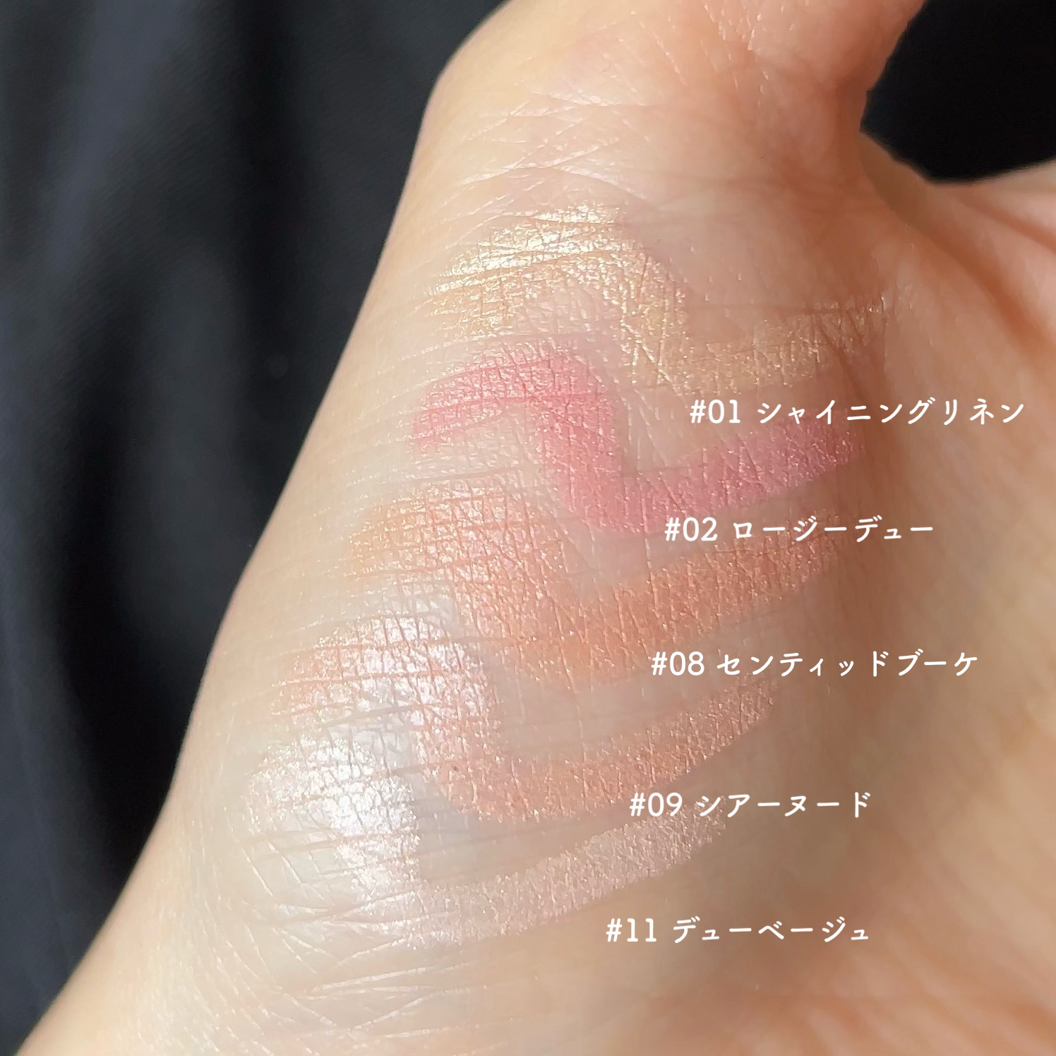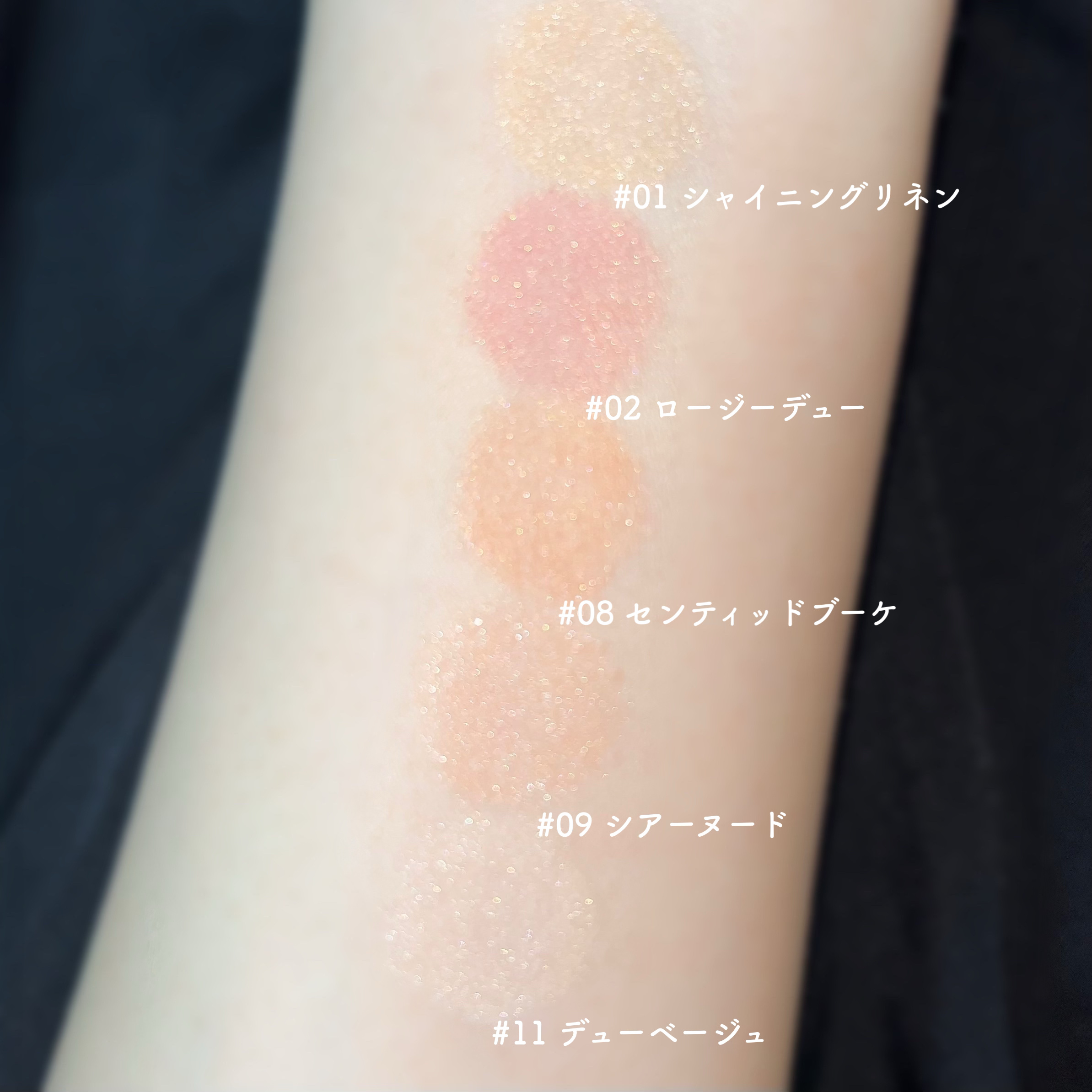 - <#1 Shining Linen(シャイニングリネン) > マイカ、酸化チタン、(ジメチコン/ジビニルジメチコン/シルセスキオキサン)クロスポリマー、シリカ、ナイロン-12、ポリメタクリル酸メチル、ベヘノキシPEG-10ジメチコン、ヤシ油脂肪酸イソアミル、ジメチコン、窒化ホウ素、合成フルオロフロゴパイト、ペンチレングリコール、トリ(ベヘン酸/イソステアリン酸/エイコサン二酸)グリセリル、酸化鉄、カプリリルグリコール、クエン酸トリエチル、ケイ酸(Al/Mg)、エチルヘキシルグリセリン、アルギン酸Na、ポリアクリル酸Na、カプリルヒドロキサム酸、グリセリン、酸化スズ、トコフェロール <#2 Rosy Dew(ロージーデュー)> 酸化チタン、マイカ、(ジメチコン/ジビニルジメチコン/シルセスキオキサン)クロスポリマー、シリカ、ナイロン-12、ポリメタクリル酸メチル、ベヘノキシPEG-10ジメチコン、ヤシ油脂肪酸イソアミル、酸化鉄、ジメチコン、窒化ホウ素、合成フルオロフロゴパイト、ペンチレングリコール、トリ(ベヘン酸/イソステアリン酸/エイコサン二酸)グリセリル、カプリリルグリコール、クエン酸トリエチル、コチニール、ケイ酸(Al/Mg)、エチルヘキシルグリセリン、アルギン酸Na、ポリアクリル酸Na、カプリルヒドロキサム酸、グリセリン、トコフェロール <#8 Scented Bouquet(センティッドブーケ) > マイカ、酸化チタン、(ジメチコン/ジビニルジメチコン/シルセスキオキサン)クロスポリマー、シリカ、ナイロン-12、酸化鉄、ポリメタクリル酸メチル、ベヘノキシPEG-10ジメチコン、ヤシ油脂肪酸イソアミル、ジメチコン、窒化ホウ素、合成フルオロフロゴパイト、ペンチレングリコール、トリ(ベヘン酸/イソステアリン酸/エイコサン二酸)グリセリル、カプリリルグリコール、クエン酸トリエチル、コチニール、ケイ酸(Al/Mg)、エチルヘキシルグリセリン、アルギン酸Na、ポリアクリル酸Na、カプリルヒドロキサム酸、グリセリン、トコフェロール <#9 Sheer Nude(シアーヌード)> マイカ、酸化チタン、(ジメチコン/ジビニルジメチコン/シルセスキオキサン)クロスポリマー、シリカ、ナイロン-12、ポリメタクリル酸メチル、ベヘノキシPEG-10ジメチコン、ヤシ油脂肪酸イソアミル、ジメチコン、窒化ホウ素、酸化鉄、合成フルオロフロゴパイト、ペンチレングリコール、トリ(ベヘン酸/イソステアリン酸/エイコサン二酸)グリセリル、カプリリルグリコール、クエン酸トリエチル、ケイ酸(Al/Mg)、エチルヘキシルグリセリン、アルギン酸Na、ポリアクリル酸Na、カプリルヒドロキサム酸、グリセリン、トコフェロール <#10 Classy Fig(クラッシィーフィグ)> マイカ、酸化チタン、(ジメチコン/ジビニルジメチコン/シルセスキオキサン)クロスポリマー、ホウケイ酸(Ca/Na)、シリカ、酸化鉄、ナイロン-12、ポリメタクリル酸メチル、ベヘノキシPEG-10ジメチコン、ヤシ油脂肪酸イソアミル、ジメチコン、窒化ホウ素、合成フルオロフロゴパイト、ペンチレングリコール、トリ(ベヘン酸/イソステアリン酸/エイコサン二酸)グリセリル、カプリリルグリコール、クエン酸トリエチル、ケイ酸(Al/Mg)、カルミン、エチルヘキシルグリセリン、アルギン酸Na、ポリアクリル酸Na、カプリルヒドロキサム酸、グリセリン、酸化スズ、トコフェロール <#11 Dew Beige(デューベージュ)> 酸化チタン、マイカ、ホウケイ酸(Ca/Na)、(ジメチコン/ジビニルジメチコン/シルセスキオキサン)クロスポリマー、シリカ、ナイロン-12、ポリメタクリル酸メチル、ベヘノキシPEG-10ジメチコン、ヤシ油脂肪酸イソアミル、ジメチコン、窒化ホウ素、合成フルオロフロゴパイト、ペンチレングリコール、トリ(ベヘン酸/イソステアリン酸/エイコサン二酸)グリセリル、カプリリルグリコール、クエン酸トリエチル、ケイ酸(Al/Mg)、酸化鉄、エチルヘキシルグリセリン、アルギン酸Na、ポリアクリル酸Na、カプリルヒドロキサム酸、グリセリン、酸化スズ、コチニール、マルトデキストリン、トコフェロール