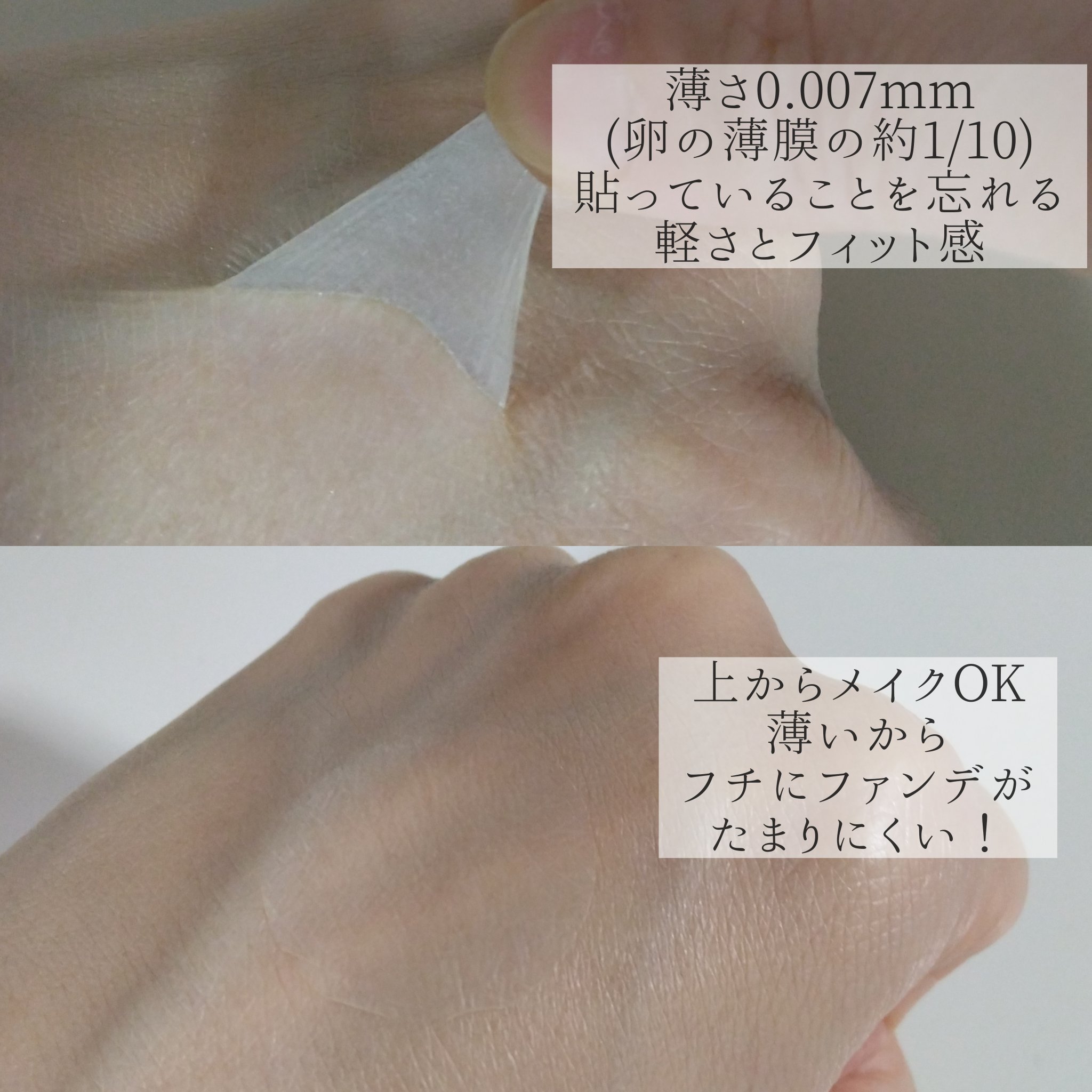 - UVを約97%*1カットして、ニキビ跡・キズあと・シミ・レーザー後の肌を守る*2、極薄UVブロックフィルム。 日常使いから、ゴルフ・海水浴などのアウトドアまで、幅広くご使用いただけます。 【貼っている間ずっとUV・摩擦や乾燥の刺激から肌を守る】 filmorは貼っている間、高いUVブロック率がずっと続きます。 衣類等との摩擦にも強く、防水性があるため、肌からはがれにくく長時間ご使用いただけます。 【快適な貼りごこち】 フィルムの薄さは0.007mm(卵の薄皮の約1/10の薄さ)と極薄。貼っていることを忘れるほど、とても軽くやわらかい貼りごこちです。 また、汗をかいてもムレにくいフィルムを使用しているので暑い季節でも快適にお使いいただけます。 【透明で目立ちにくい】 透明でテカリを抑えたフィルムなので、周りから貼っていることが気付かれにくいです。 また上からメイクをしていただくと、さらに自然な仕上がりに。 フィルムを貼ることで、キズあとに直接化粧品や指が触れることを防ぎます。 *1自社調べ *2フィルムの物理的効果による