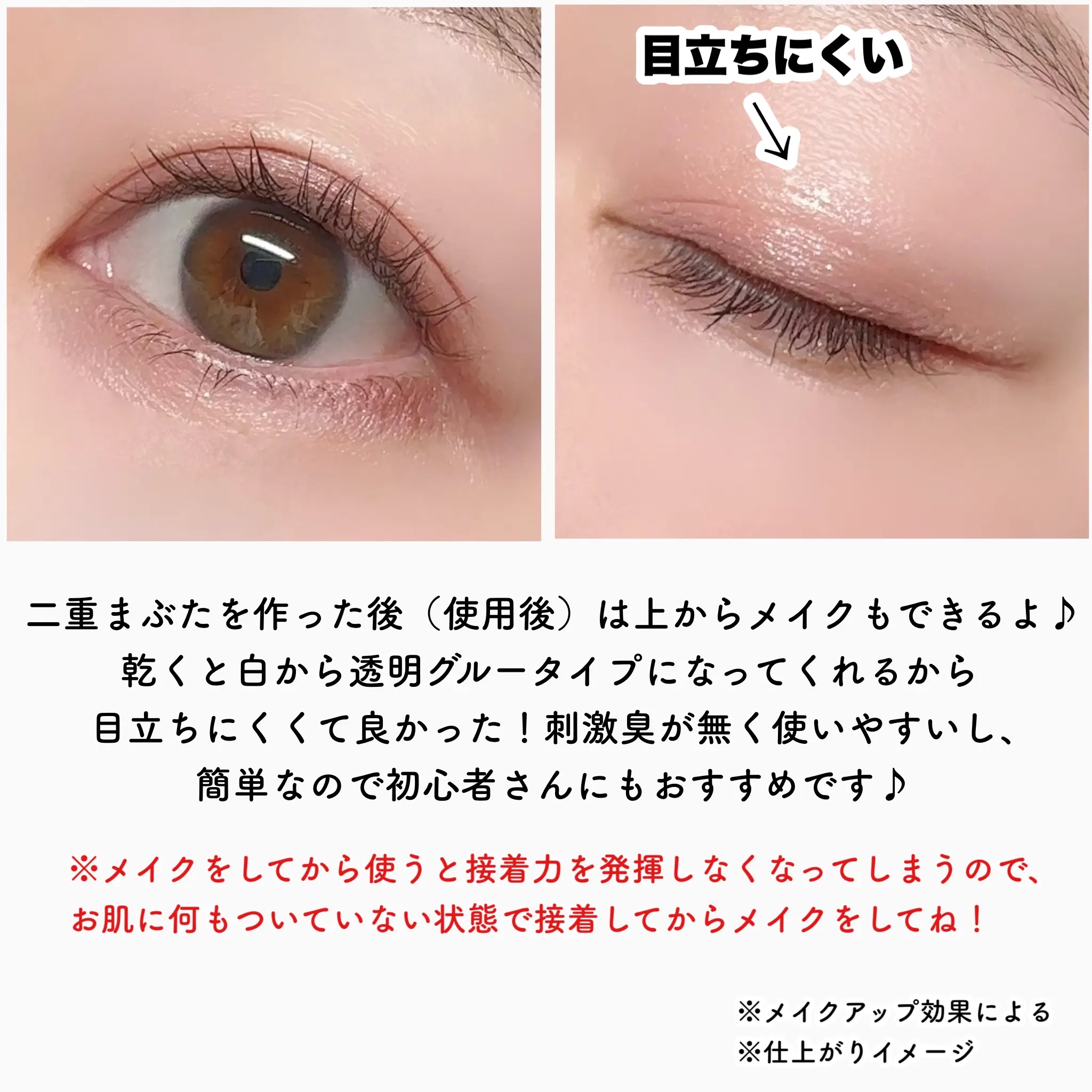 - ダブル洗顔(クレンジング+泡洗顔)をしないと落とせないほどしっかりと接着します。 水に濡れても白くならず、美しい二重まぶたを長時間キープできます。刺激臭もなく、使いやすい処方です。 ローズマリー葉エキス(保湿成分)、カミツレ花エキス(保湿成分)配合。