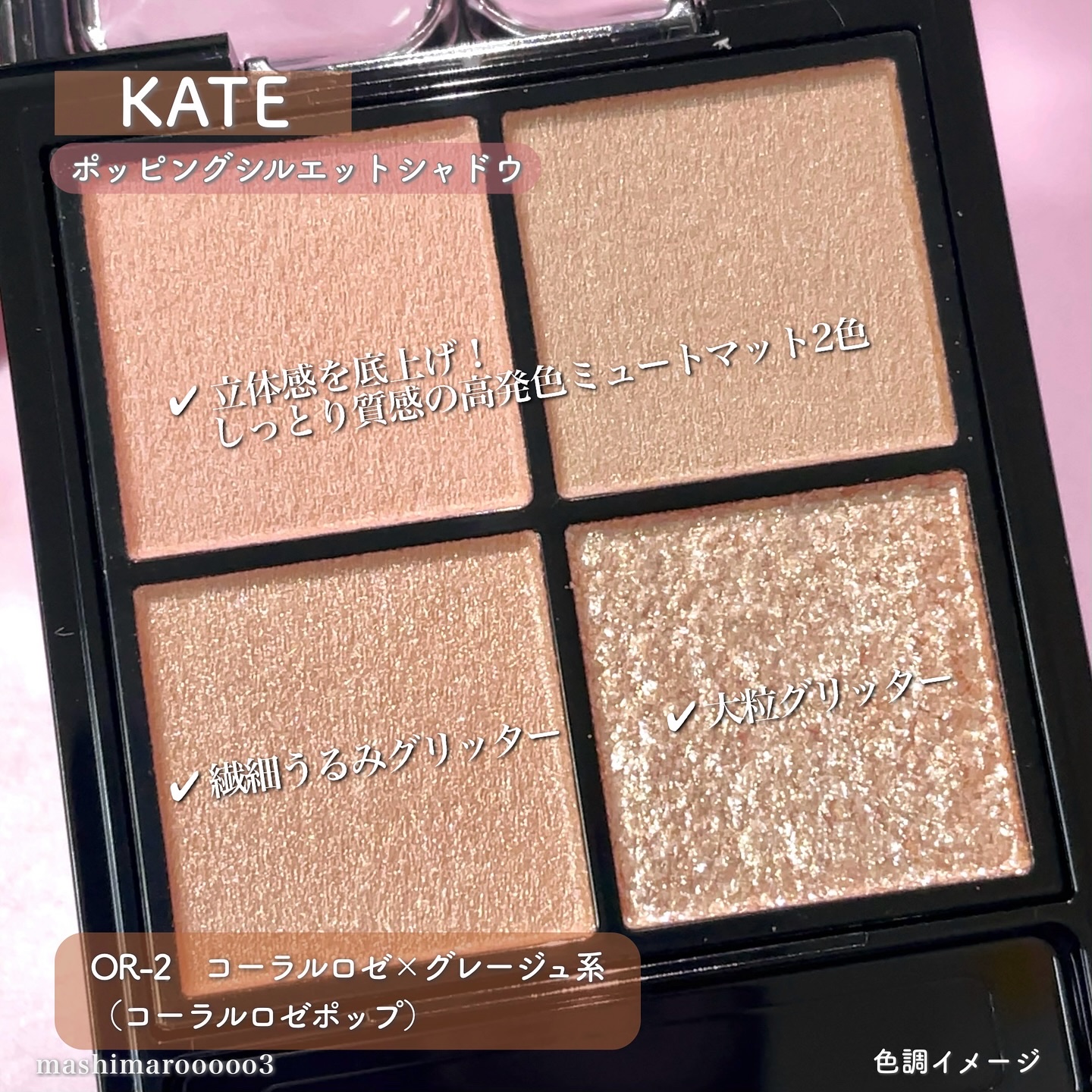KATE様のプロモーションに参加していますポッピングシルエットシャドウ正反対の2つの質感コントラストでポップアップするような立体感を引き立てる質感トリックシャドウ✨4月19日にコーラルロゼ×グレージュ系、ラズベリーロゼ×グレージュ系が登場しま...