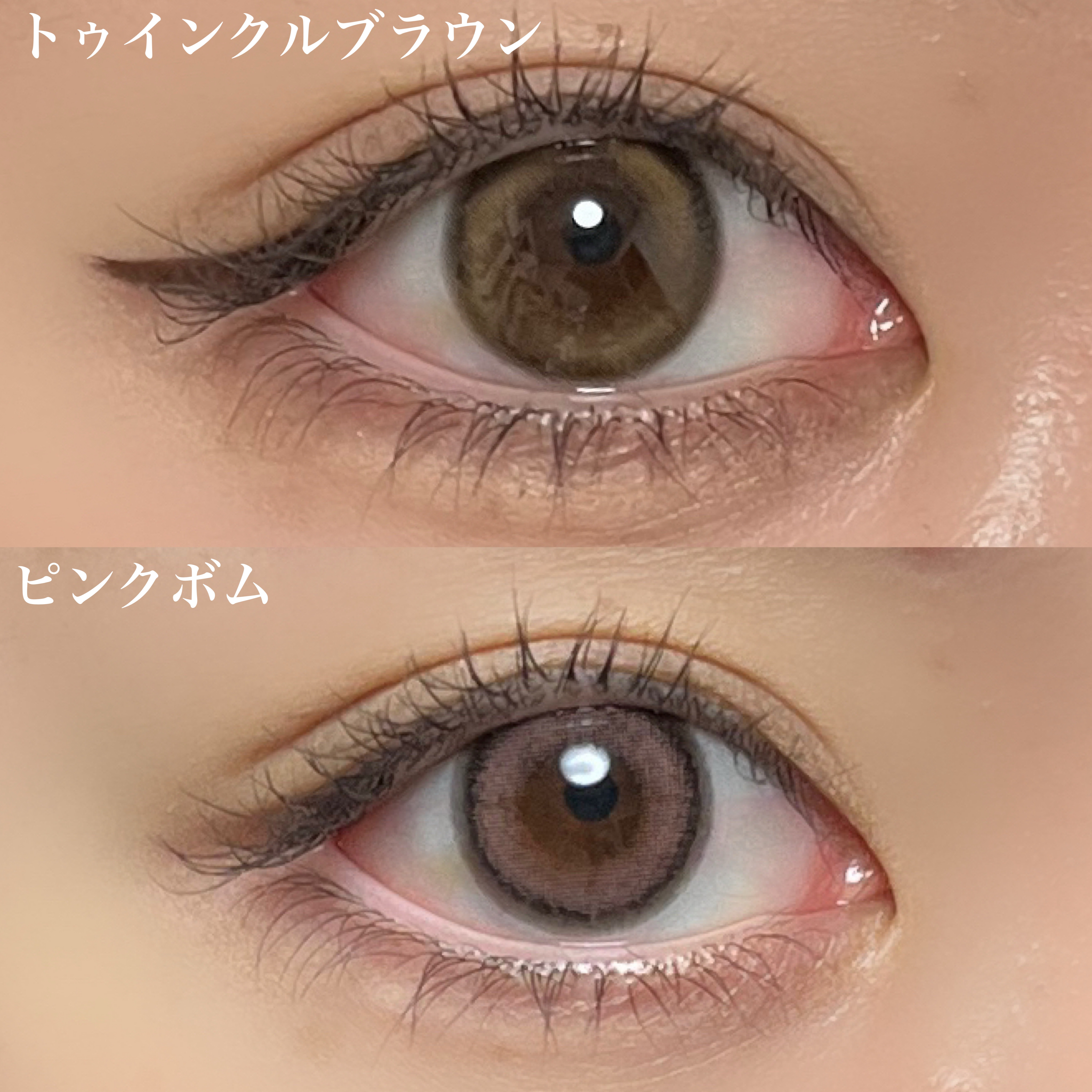 日常使いで盛りたい日にもぴったりな トゥインクルブラウンはブラウンのフチに、少し明るいブラウンがふんわり色づいて3つのハイライトが入ったきらきらブラウン💓 ふわふわな太フチでラブリーな印象にもなれるピンクボムはピンクすぎないから普段つけててもピンクってバレにくいかも!! あまあまピンクでガーリーな印象に!!