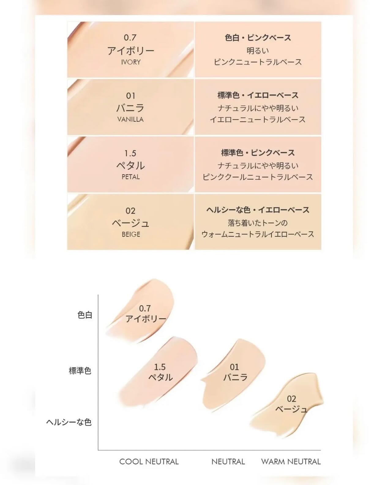 - <0.7 アイボリー> 水、シクロペンタシロキサン、トリメチルシロキシケイ酸、グリセリン、プロパンジオール、ジフェニルシロキシフェニルトリメチコン、イソノナン酸イソノニル、ラウリルPEG-9ポリジメチルシロキシエチルジメチコン、ジメチコン、ジ(カプリル/カプリン酸)BG、カプリリルメチコン、ナイアシンアミド、炭酸ジカプリリル、イソドデカン、合成フルオロフロゴパイト、トリシロキサン、1,2-ヘキサンジオール、シリカ、ジステアルジモニウムヘクトライト、PEG-10ジメチコン、硫酸Mg、オクチルドデカノール、トリエトキシカプリリルシラン、セテアリルジメチコンクロスポリマー、ポリメチルシルセスキオキサン、ステアリン酸、水酸化Al、ポリヒドロキシステアリン酸、アルミナ、ポリグリセリル-3ポリジメチルシロキシエチルジメチコン、パルミチン酸エチルヘキシル、ミリスチン酸イソプロピル、イソステアリン酸、レシチン、香料、イソステアリン酸ポリグリセリル-4、アデノシン、エチレンジアミンジコハク酸3Na、ポリリシノレイン酸ポリグリセリル-3、トリイソステアリン酸イソプロピルチタン、ジエチルヘキサン酸ネオペンチルグリコール、トコフェロール、DPG、BG、カエサルピニアスピノサ果実エキス、カッパフィカスアルバレジエキス、(ジメチコン/ビニルジメチコン)クロスポリマー、マデカシン酸、アシアチン酸、アシアチコシド、リン酸2Na、イソステアリン酸水添ヒマシ油、ヒアルロン酸Na、キサンタンガム、リン酸Na、異性化糖、カニナバラ果実エキス、カプリル酸グリセリル、ヒアルロン酸ヒドロキシプロピルトリモニウム、加水分解ヒアルロン酸、アセチルヒアルロン酸Na、ヒアルロン酸、加水分解ヒアルロン酸Na、ヒアルロン酸クロスポリマーNa、ヒアルロン酸K、酸化チタン、酸化鉄 <1.5 ペタル> 水、シクロペンタシロキサン、トリメチルシロキシケイ酸、グリセリン、プロパンジオール、ジフェニルシロキシフェニルトリメチコン、イソノナン酸イソノニル、ラウリルPEG-9ポリジメチルシロキシエチルジメチコン、ジメチコン、イソドデカン、ジ(カプリル/カプリン酸)BG、カプリリルメチコン、ナイアシンアミド、炭酸ジカプリリル、合成フルオロフロゴパイト、トリシロキサン、1,2-ヘキサンジオール、シリカ、ジステアルジモニウムヘクトライト、PEG-10ジメチコン、硫酸Mg、オクチルドデカノール、トリエトキシカプリリルシラン、セテアリルジメチコンクロスポリマー、ポリメチルシルセスキオキサン、ステアリン酸、水酸化Al、ポリヒドロキシステアリン酸、アルミナ、ポリグリセリル-3ポリジメチルシロキシエチルジメチコン、イソステアリン酸ポリグリセリル-4、パルミチン酸エチルヘキシル、ミリスチン酸イソプロピル、イソステアリン酸、レシチン、香料、アデノシン、エチレンジアミンジコハク酸3Na、ポリリシノレイン酸ポリグリセリル-3、トリイソステアリン酸イソプロピルチタン、ジエチルヘキサン酸ネオペンチルグリコール、トコフェロール、DPG、BG、カエサルピニアスピノサ果実エキス、カッパフィカスアルバレジエキス、(ジメチコン/ビニルジメチコン)クロスポリマー、マデカシン酸、アシアチン酸、アシアチコシド、リン酸2Na、イソステアリン酸水添ヒマシ油、ヒアルロン酸Na、キサンタンガム、リン酸Na、異性化糖、カニナバラ果実エキス、カプリル酸グリセリル、ヒアルロン酸ヒドロキシプロピルトリモニウム、加水分解ヒアルロン酸、アセチルヒアルロン酸Na、ヒアルロン酸、加水分解ヒアルロン酸Na、ヒアルロン酸クロスポリマーNa、ヒアルロン酸K、酸化チタン、酸化鉄 <02 ベージュ> 水、シクロペンタシロキサン、トリメチルシロキシケイ酸、グリセリン、プロパンジオール、ジフェニルシロキシフェニルトリメチコン、イソノナン酸イソノニル、ラウリルPEG-9ポリジメチルシロキシエチルジメチコン、ジメチコン、イソドデカン、ジ(カプリル/カプリン酸)BG、カプリリルメチコン、ナイアシンアミド、炭酸ジカプリリル、合成フルオロフロゴパイト、トリシロキサン、1,2-ヘキサンジオール、シリカ、ジステアルジモニウムヘクトライト、PEG-10ジメチコン、硫酸Mg、オクチルドデカノール、トリエトキシカプリリルシラン、セテアリルジメチコンクロスポリマー、ポリメチルシルセスキオキサン、ステアリン酸、水酸化Al、ポリヒドロキシステアリン酸、アルミナ、ポリグリセリル-3ポリジメチルシロキシエチルジメチコン、イソステアリン酸ポリグリセリル-4、パルミチン酸エチルヘキシル、ミリスチン酸イソプロピル、イソステアリン酸、レシチン、香料、アデノシン、トリイソステアリン酸イソプロピルチタン、エチレンジアミンジコハク酸3Na、ポリリシノレイン酸ポリグリセリル-3、ジエチルヘキサン酸ネオペンチルグリコール、トコフェロール、DPG、BG、カエサルピニアスピノサ果実エキス、カッパフィカスアルバレジエキス、(ジメチコン/ビニルジメチコン)ク