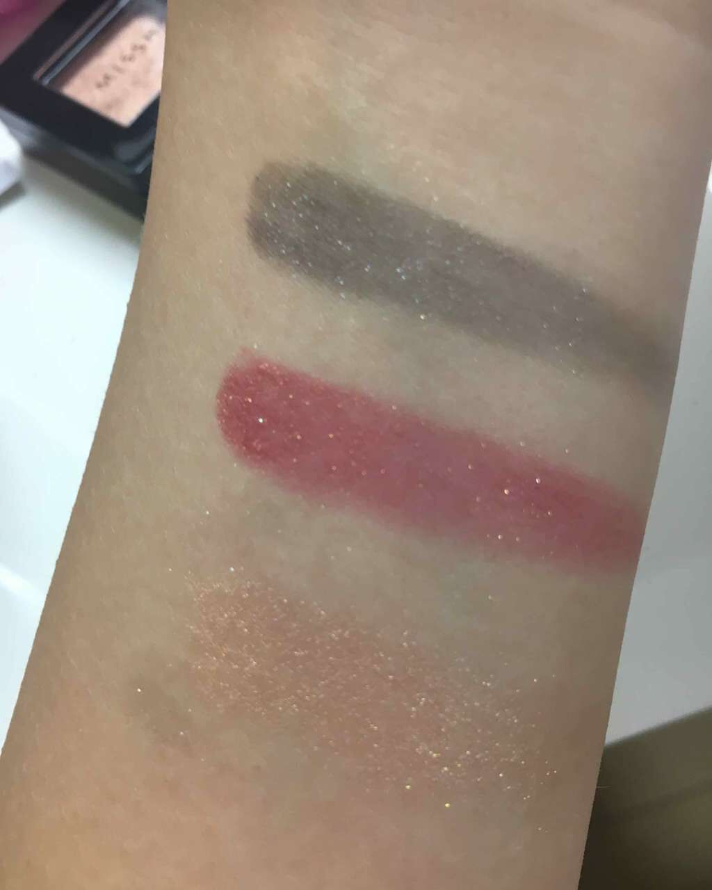 キャンドゥ🌷スターライトアイグロス!!!100均シリーズです!こちらはとても発色が良くてラメがギラギラで可愛い💞安いし6色展開なので、全色揃えるのも簡単ですね🎶実際に腕に付けて伸ばそうとしたところ、うっすり色とラメのみになってしまいました😵か...