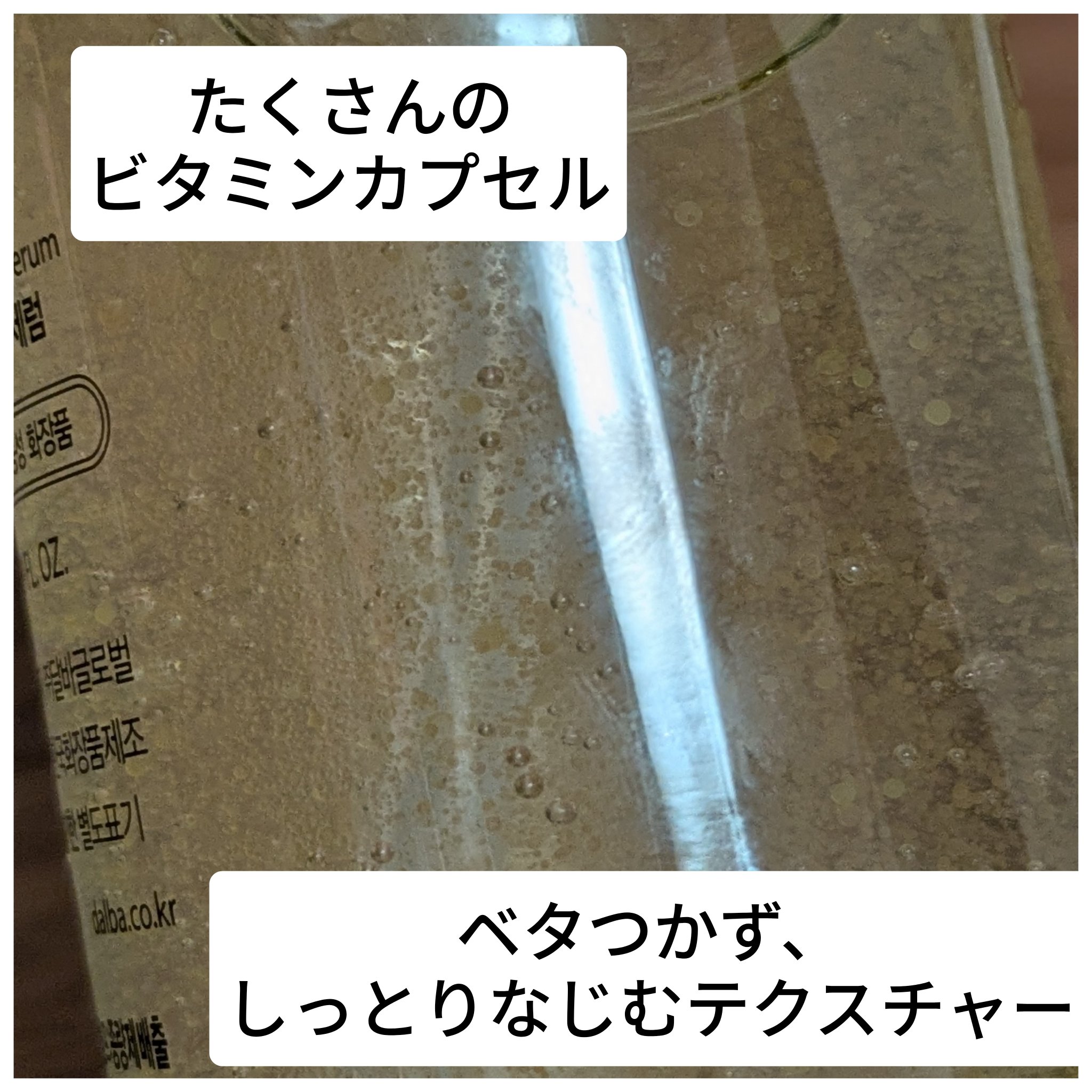 - 肌を明るくする4万*Vitaカプセルで透き通った華やかなビタトーニング べたつかずなめらかなビタミンカプセルセラム *本品容量100ml基準(製造バラつきあり、内部算出基準) 水分で満たされたふっくらとした水分ベースとビタミンカプセルが素早くブレンドされ水分膜を形成し、べたつかず、なめらかな仕上がり 【ご使用方法】 洗顔後、適量を手にとり、肌のキメに沿ってやさしくのばした後、軽くたたいて吸収させます。 TIP.2~3回レイヤリングすると、保湿·栄養集中ケアに役立ちます。 【使用上の注意】 お肌に異常が生じていないかよく注意して使用してください。 化粧品がお肌に合わないとき即ち次のような場合には、使用を中止してください。そのまま使用を続けますと、症状を悪化させることがありますので、皮ふ科専門医等にご相談されることをおすすめします。 (1)使用中、赤味、はれ、かゆみ、刺激、色抜け(白斑等)や黒ずみ等の異常があらわれた場合 (2)使用したお肌に、直射日光があたって(1)のような異常があらわれた場合