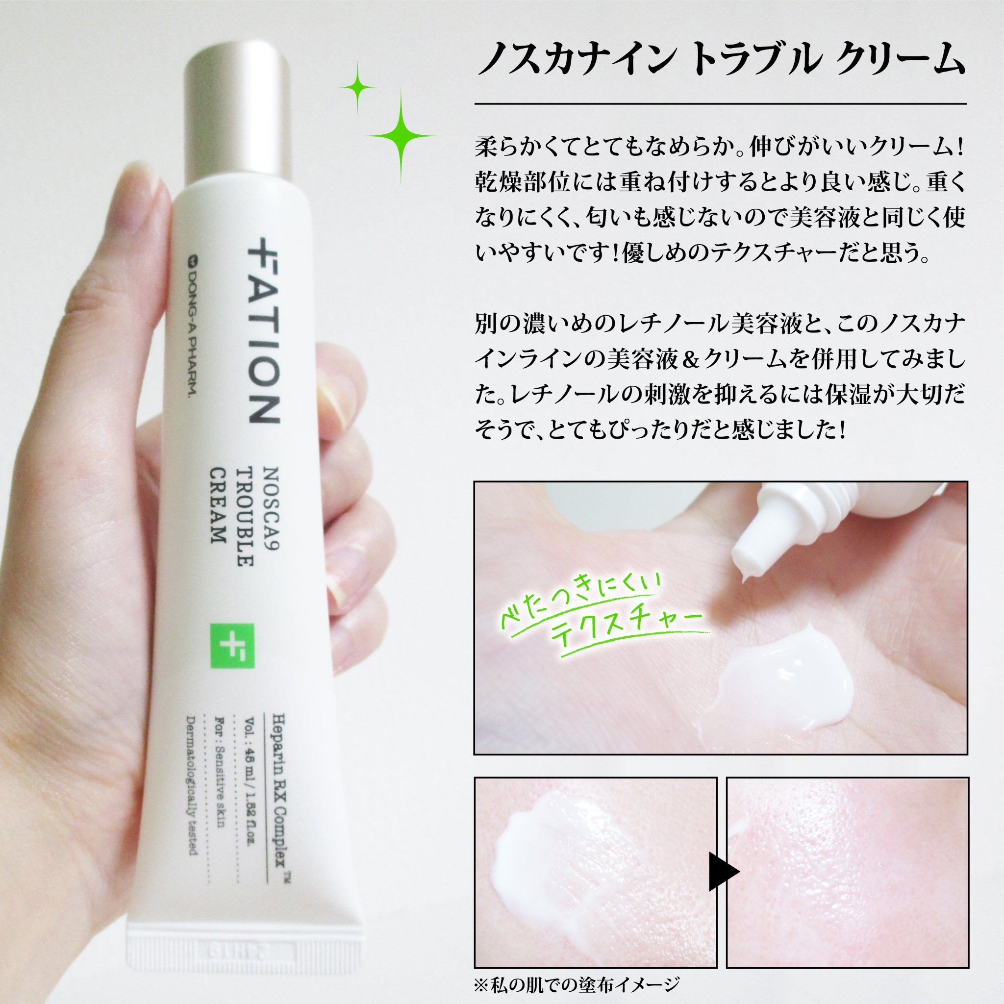 韓国のダーマコスメブランド、パティオン。 トラブル肌の為に開発された東亜製薬の独自の特許うるおい成分であるヘパリンRXコンプレッス™️が配合されていて油分のバランスを整えて鎮静ケア・肌荒れを防止します。 ノスカナイン トラブル セラムはとろみのあるテクスチャーながら肌なじみ良く、すぐに肌に吸収されます。 ノスカナイン トラブルクリームはこっくりしたテクスチャーながら重さは全くなく伸ばしていくとサラサラ仕上がり。
