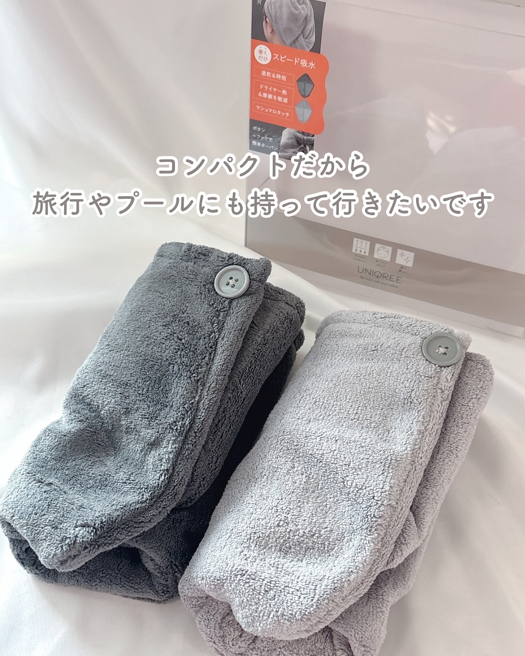 - #毎日できる美髪ケア お風呂上りの面倒くさいをラクに✨ 髪を乾かす手間を時短⏰ もっと便利に使いやすく♪ 💡おすすめPoint💡 1)「マイクロファイバー」素材 ⇒10μメートル未満の細い繊維で、 柔軟性・吸水性・耐久性に優れている ⇒毛質も柔らかく、ゴシゴシいらずで、摩擦ダメージを軽減 ⇒タオルドライでドライヤー時間を短縮⏰熱ダメージも軽減! ⇒ふわふわな肌当たりで、髪をやさしく包み込む ⇒ふわふわで軽いから、首が疲れず、巻いてる感がない ⇒天日干しも、浴室乾燥でもゴワゴワパリパリしない! 2)すべてが「ちょうどいい」 ⇒大きすぎず、小さすぎず、厚すぎず、薄すぎず ⇒ロングヘアでもすっぽり収まるのに、コンパクト ⇒巻きやすさにこだわり、タオルの厚みがベストバランス ⇒タオルをきつく巻かなくても崩れない! 前髪に変なクセがつかない 額に負担がない ⇒ボタン&フック付きで、誰でも簡単にターバンにできる 3)家事・育児も時短 ⇒乾きやすい素材で洗濯もラクラク ⇒フック付きで、乾燥も収納もしやすい ⇒旅行・レジャー(温泉・プール・キャンプ)にコンパクトに携帯 ⇒毎日使いたいから、2枚セットでコスパ重視